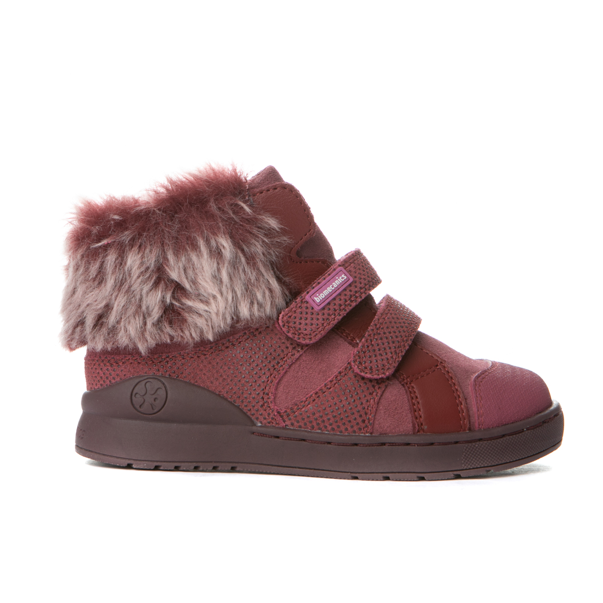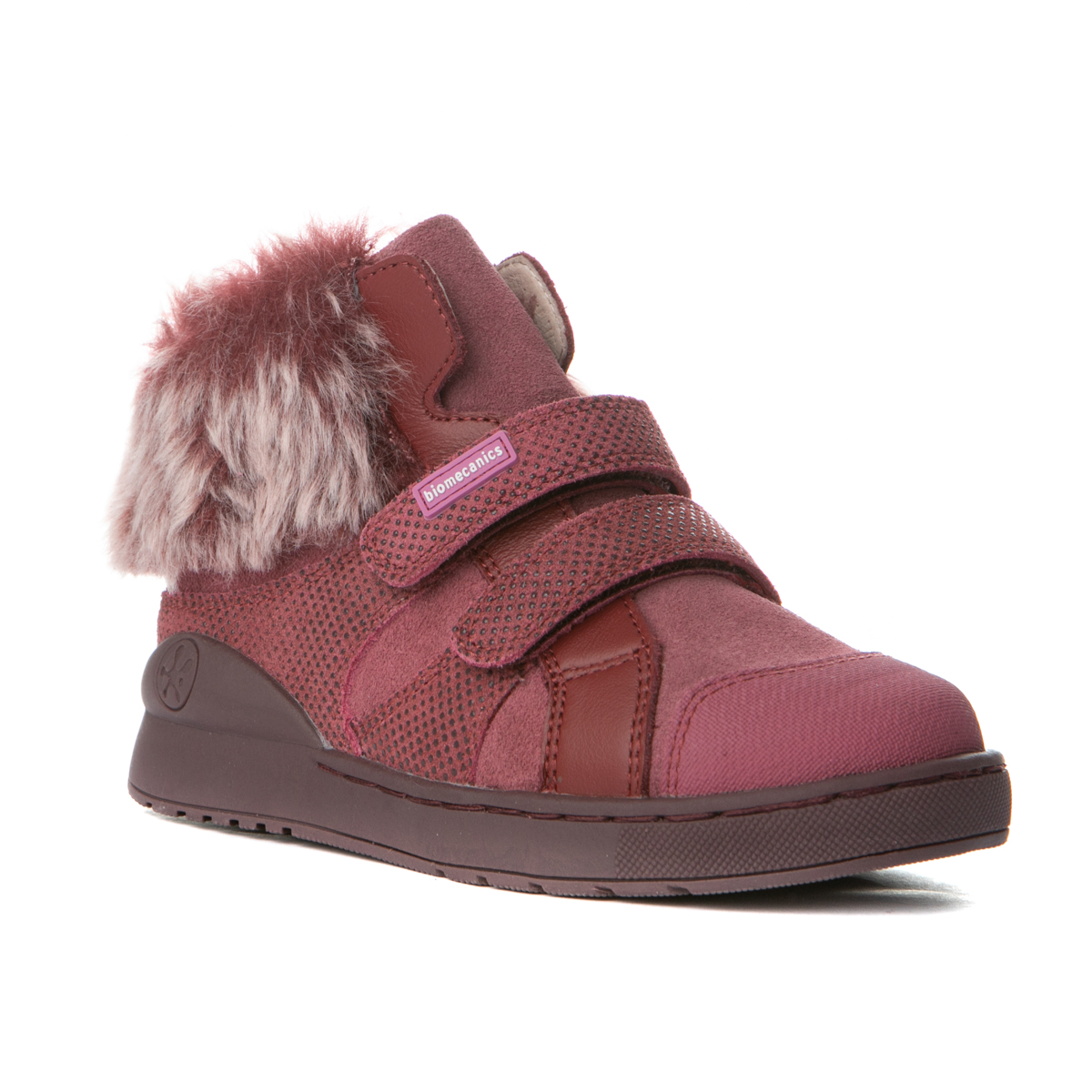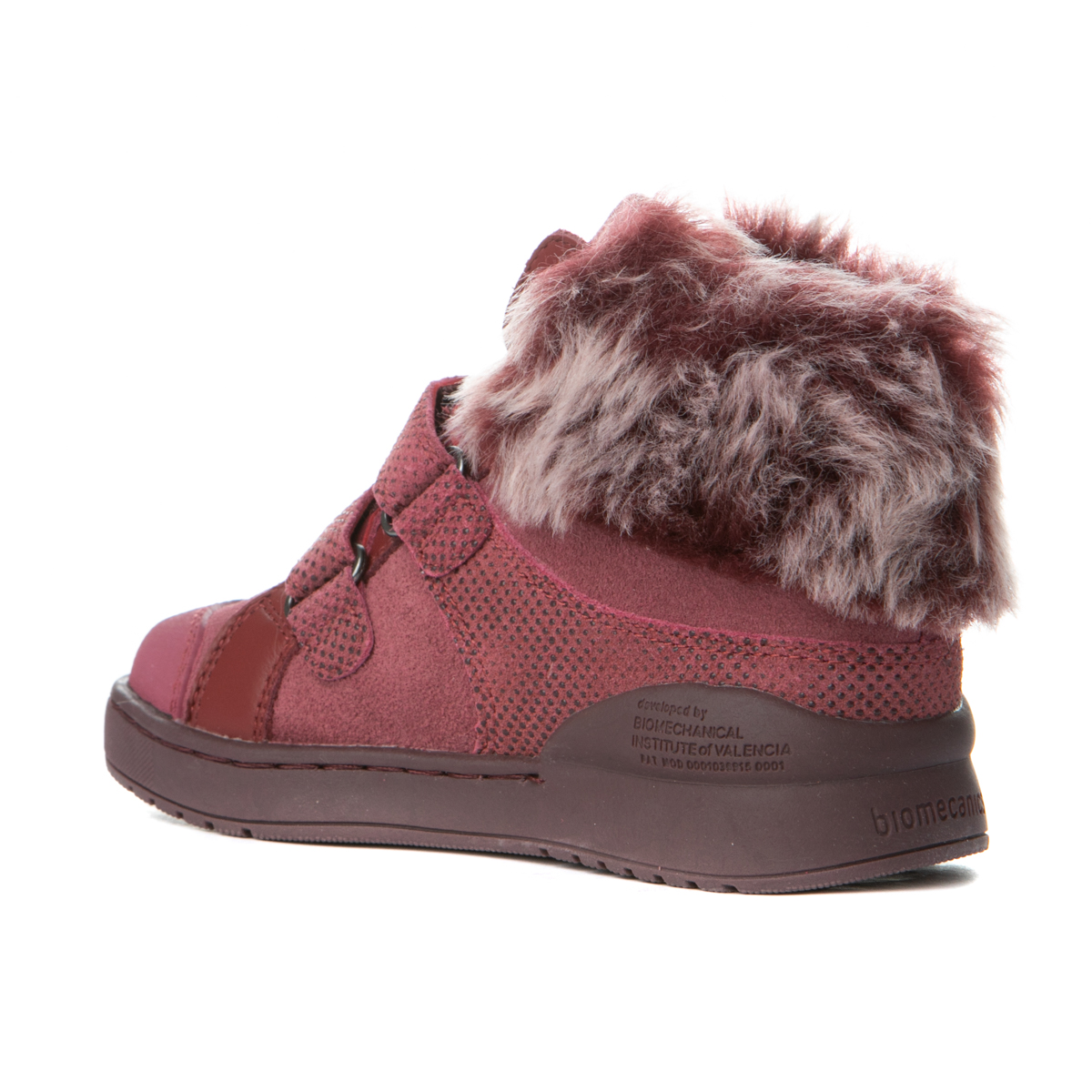 Biomecanics μποτάκι με διπλό αυτοκόλλητο και διακοσμητική γούνα στο πίσω μέρος του παπουτσιού. Το εσωτερικό του παπουτσιού αποτελείται από 100% δερμάτινη επένδυση και 100% δερμάτινο, αντιβακτηριακό, προσθαφαιρούμενο πατάκι. Τα υλικά είναι απαλαγμένα από χρώμιο και νικέλιο. Η εξωτερική σόλα αποτελείται από λάστιχο για μέγιστη ευλυγισία. Διαθέτει τεχνολογία Biogateo.