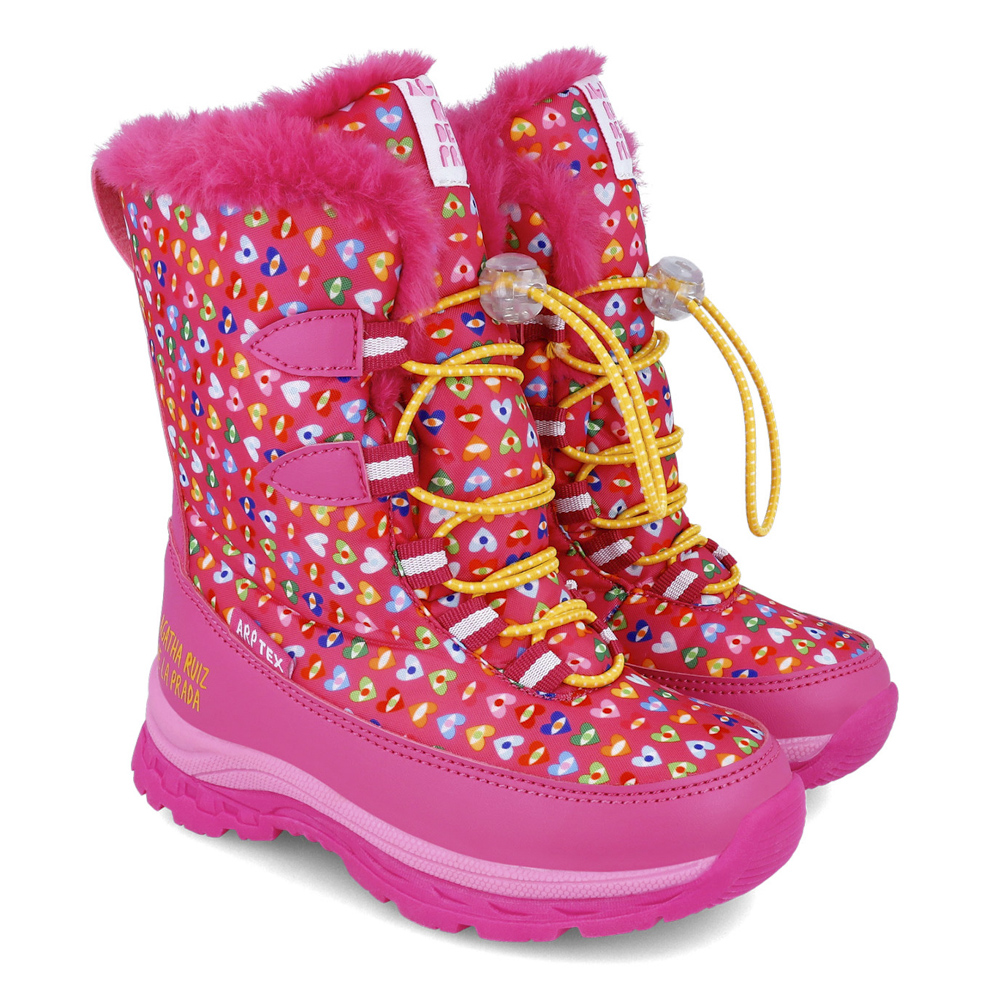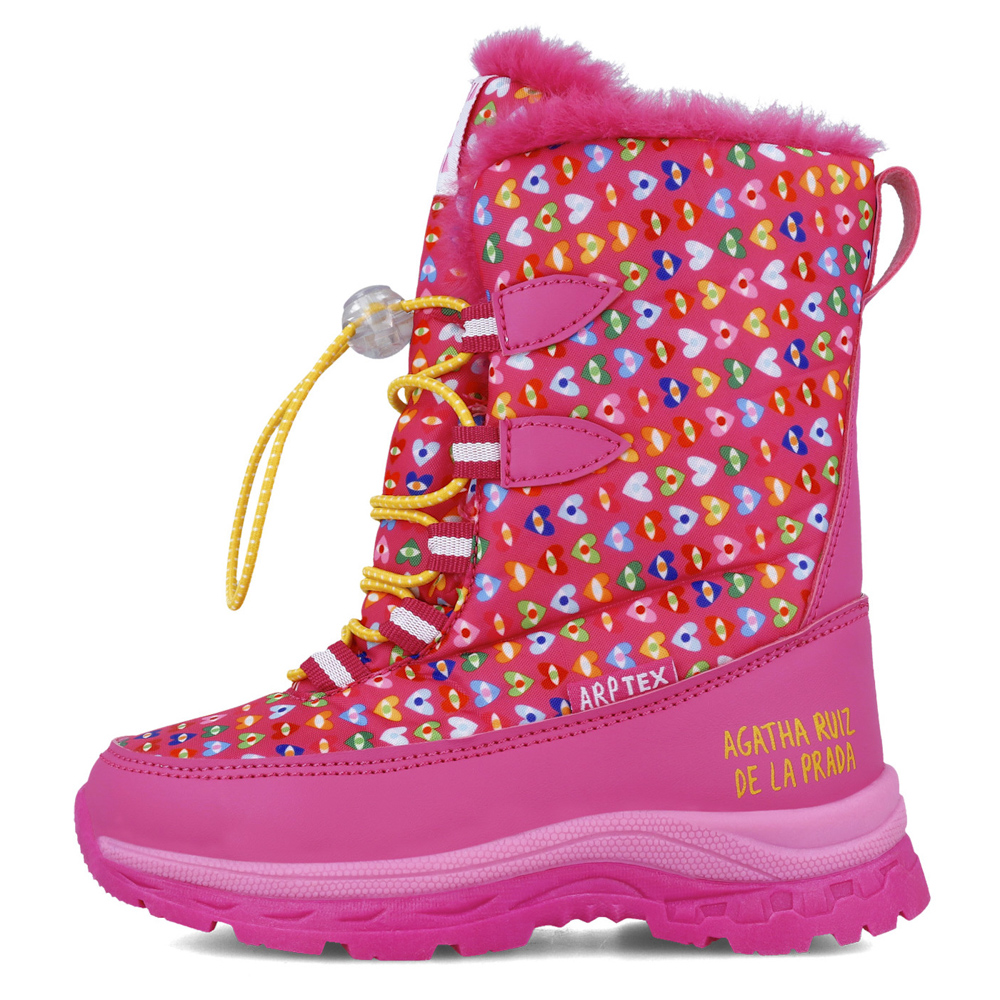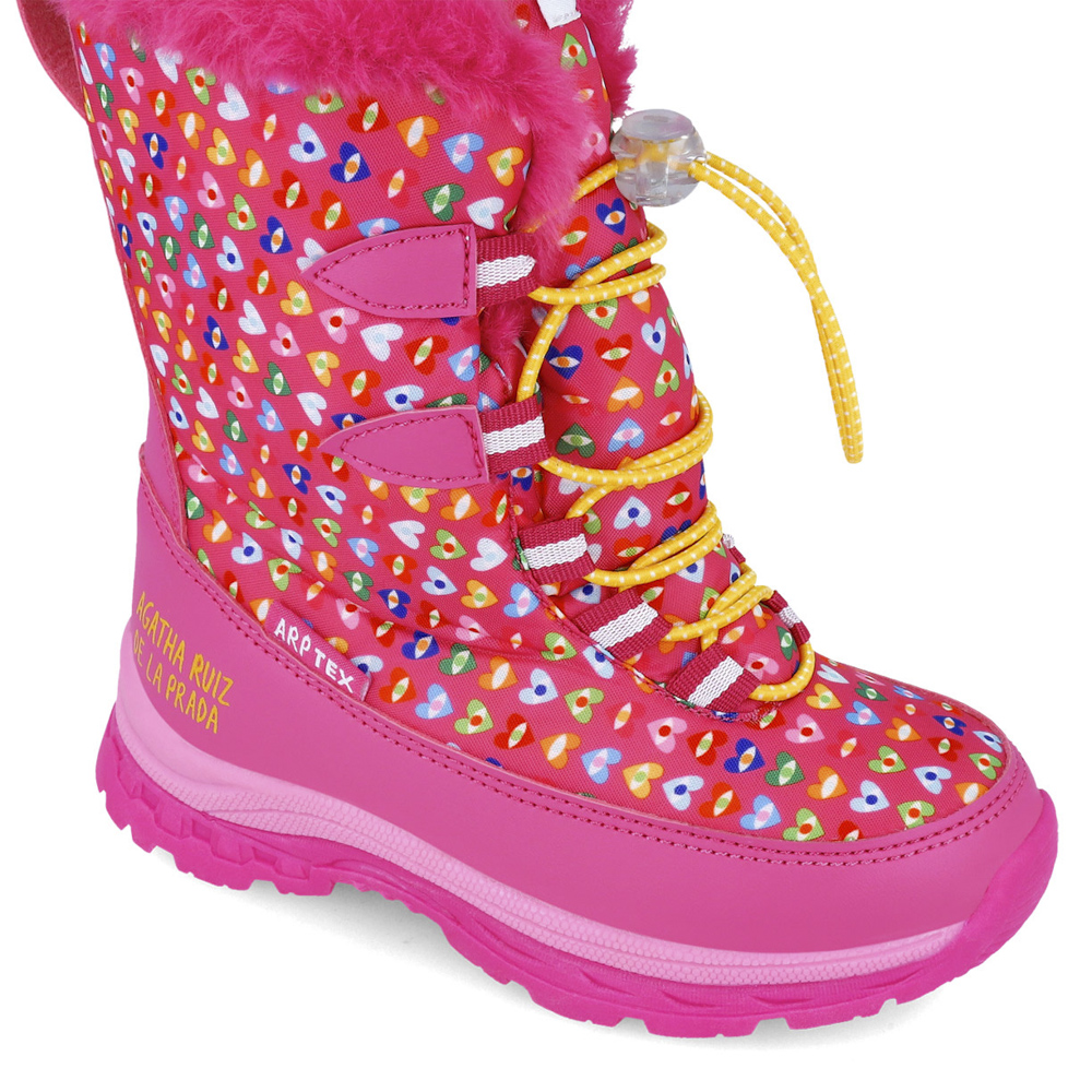 Agatha Ruiz de la Prada Apres Ski με ρυθμιζόμενο ελαστικό κορδόνι. Το εσωτερικό αποτελείται από γούνα. Η εξωτερική σόλα αποτελείται από αντιολισθητικό λάστιχο.