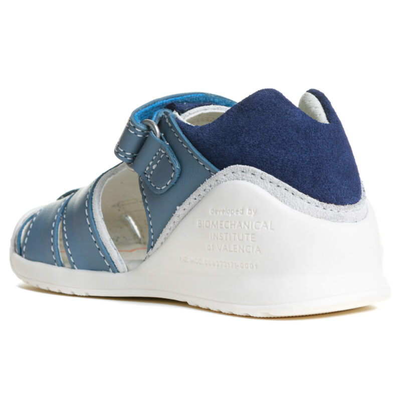 Biomecanics παπουτσοπέδιλο με αυτοκόλλητο. Διαθέτει σκούρες μπλε λεπτομέρειες. Το εσωτερικό αποτελείται από δέρμα και δερμάτινο,ανατομικό,αντιμικροβιακό πατάκι. Η εξωτερική σόλα αποτελείται από λάστιχο.