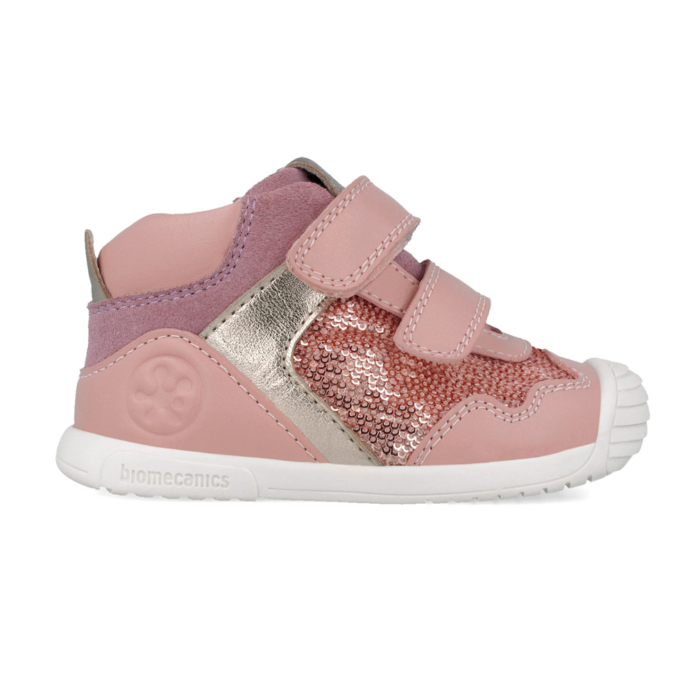 Biomecanics μποτάκι με αυτοκόλλητα. Διαθέτει γκρι λεπτομέρειες περιμετρικά. Το εσωτερικό αποτελείται από δέρμα και δερμάτινο,ανατομικό,αντιβακτηριακό πατάκι. Η εξωτερική σόλα αποτελείται από λάστιχο.