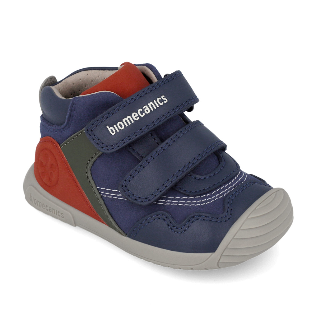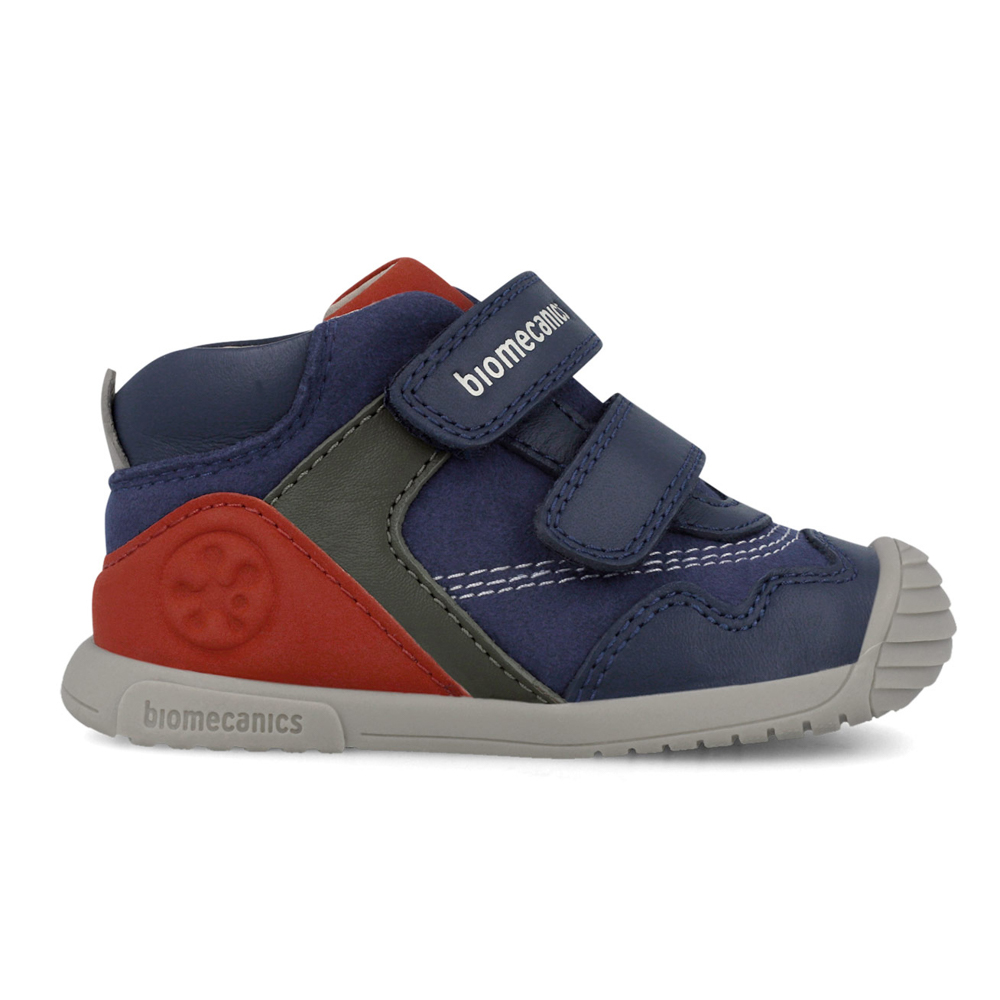 Biomecanics μποτάκι με αυτοκόλλητα. Διαθέτει κόκκινες λεπτομέρειες περιμετρικά. Το εσωτερικό αποτελείται από δέρμα και δερμάτινο,ανατομικό,αντιβακτηριακό πατάκι. Η εξωτερική σόλα αποτελείται από λάστιχο.