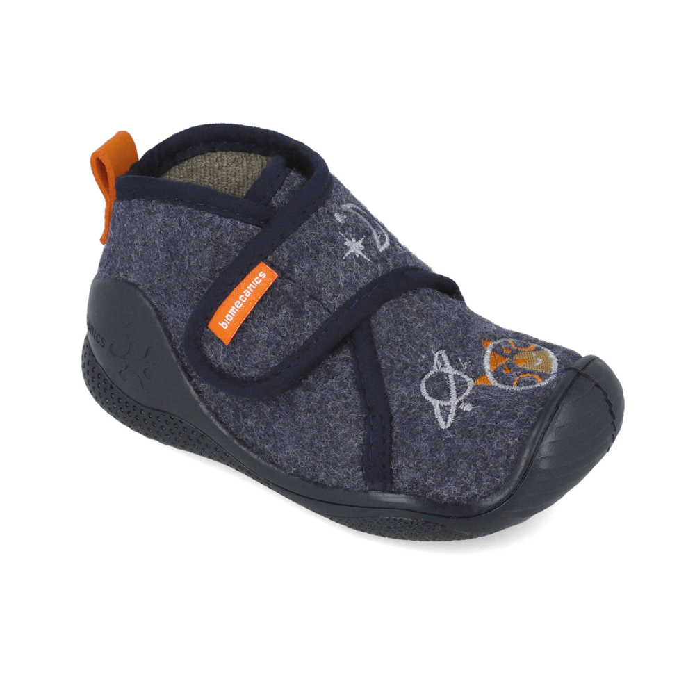 Biomecanics παντοφλάκι με αυτοκόλλητο. Διαθέτει πλανήτες μπροστά. Το εσωτερικό αποτελείται από ύφασμα και δερμάτινο,ανατομικό,αντιβακτηριακό πατάκι. Η εξωτερική σόλα αποτελείται από λάστιχο.