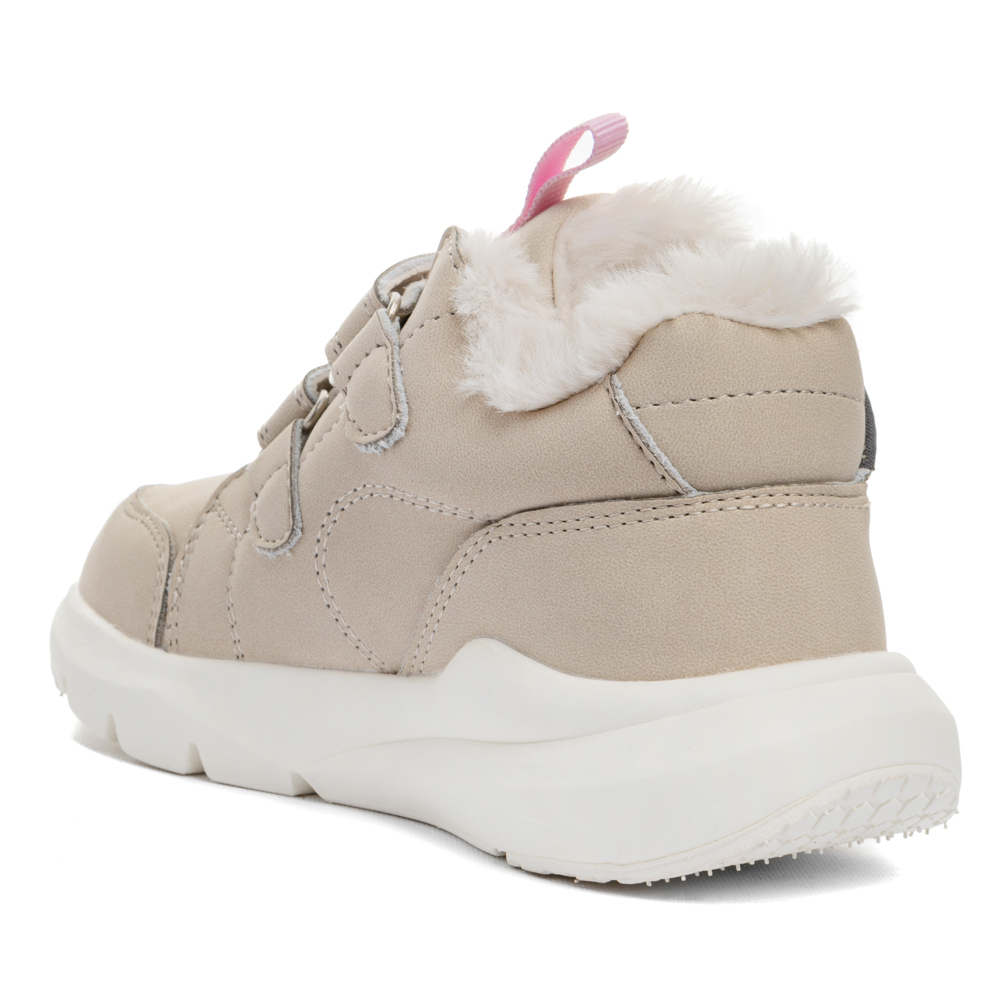 Garvalin μποτάκι με αυτοκόλλητα. Το εσωτερικό αποτελείται από γούνα και δερμάτινο πατάκι. Η εξωτερική σόλα αποτελείται από λάστιχο.