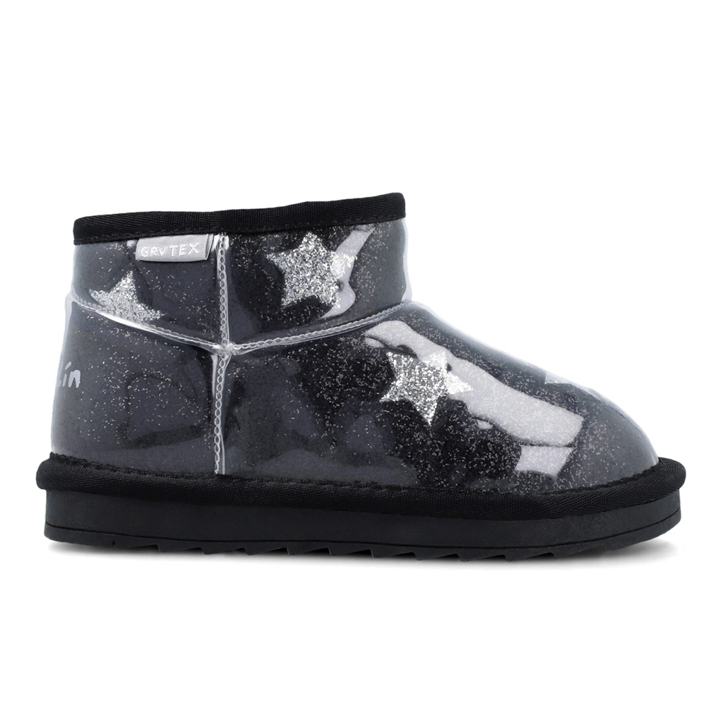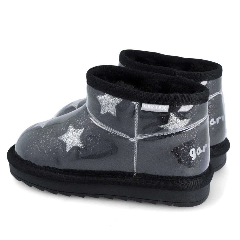Garvalin μποτάκι με γκλίτερ περιμετρικά και αστεράκια στο πλάι. Το εσωτερικό αποτελείται από γούνα. Η εξωτερική σόλα αποτελείται από λάστιχο.