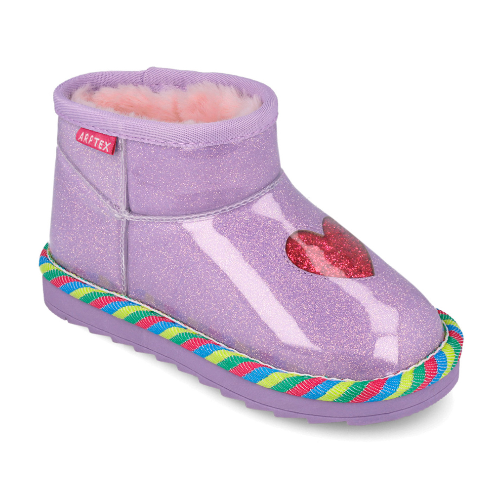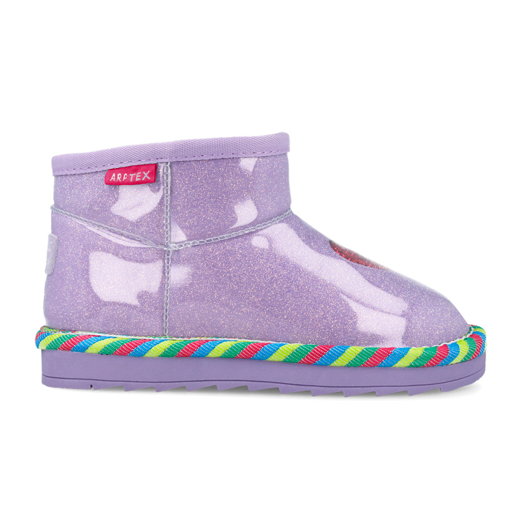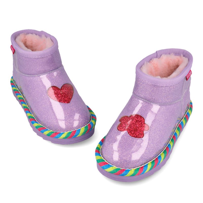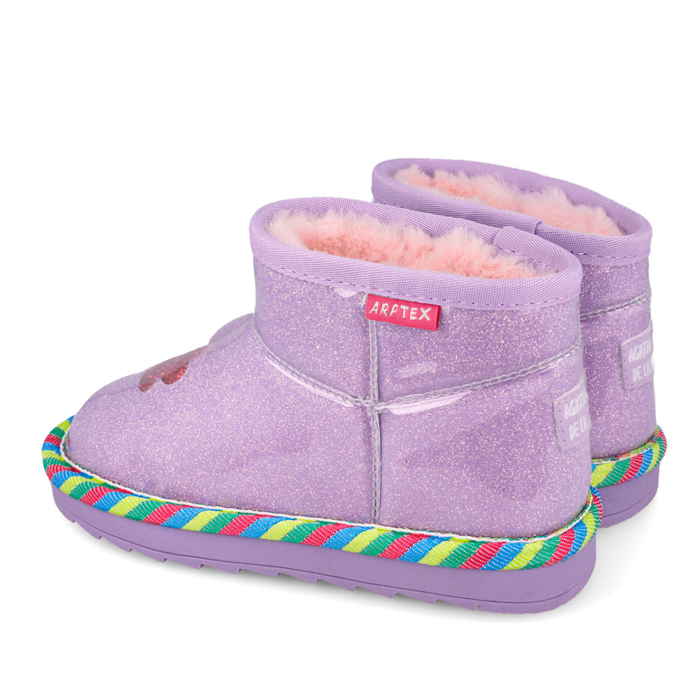 Agatha Ruiz de la Prada μποτάκι με γούνα στο εσωτερικό και γκλίτερ περιμετρικά. Η εξωτερική σόλα αποτελείται από λάστιχο. Αυτό το μποτάκι είναι αδιάβροχο.