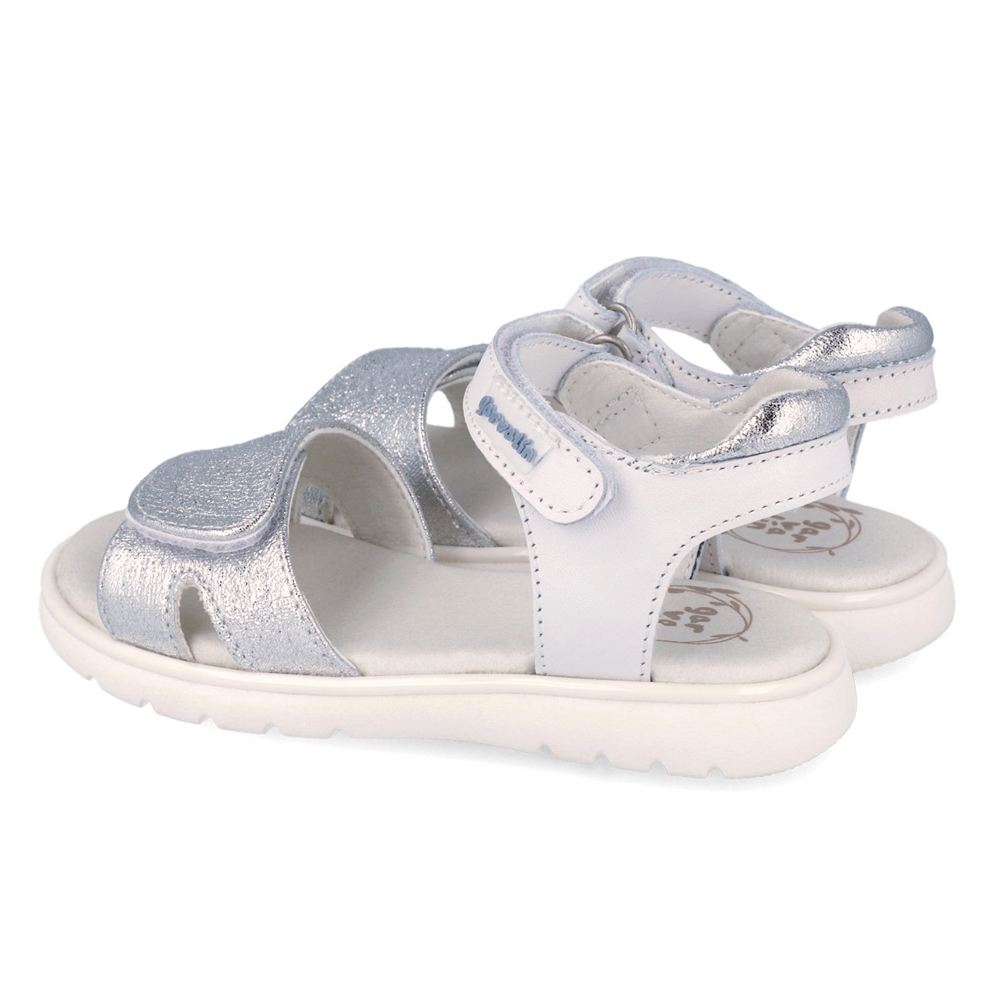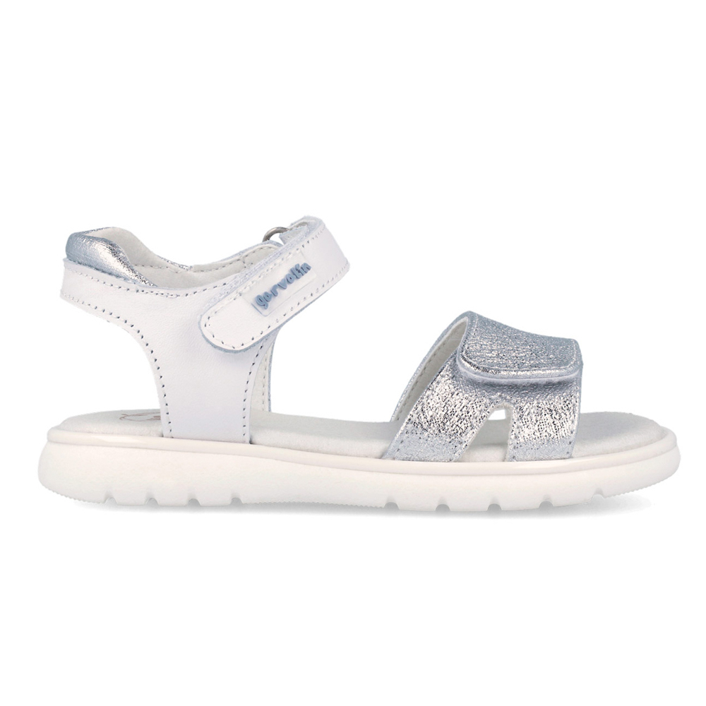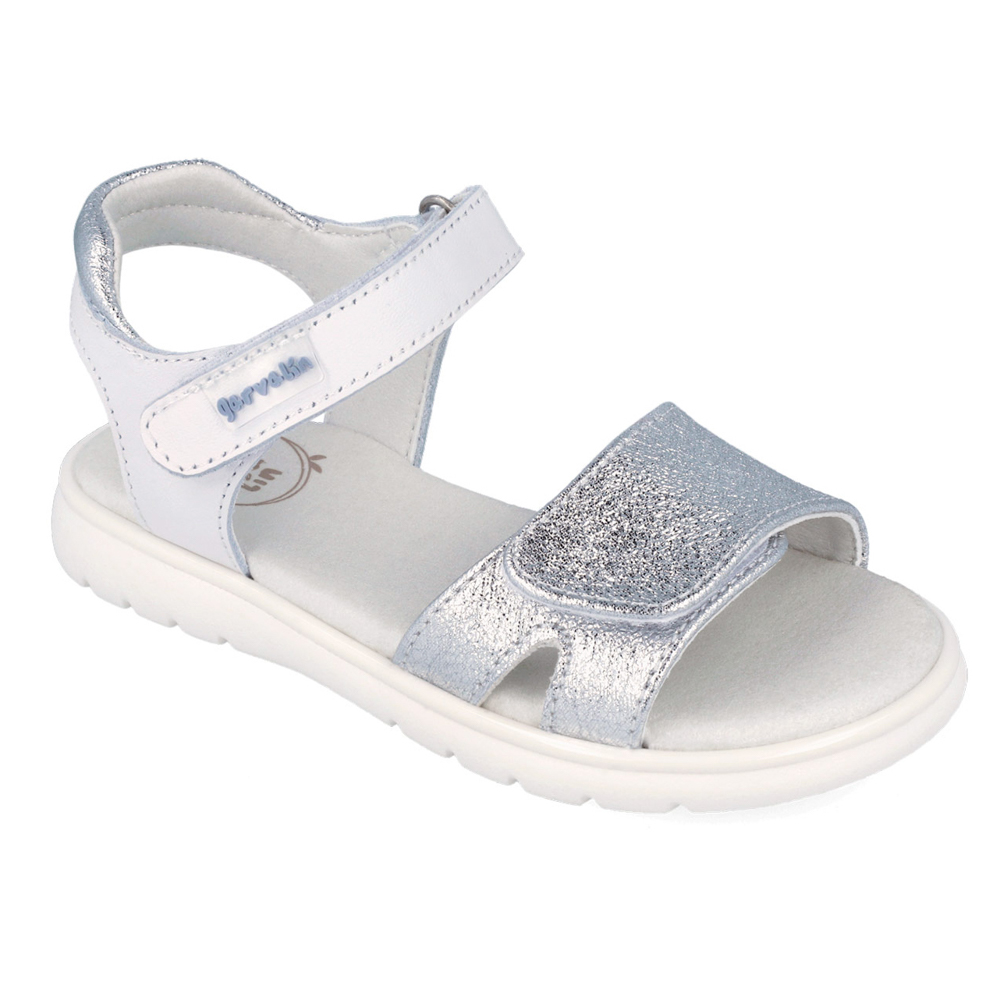 Garvalin πέδιλο με δύο αυτοκόλλητα για μάγιστη άνεση. Διαθέτει ασημί λεπτομέρεια μπροστά. Το εσωτερικό αποτελείται από δέρμα. Η εξωτερική σόλα αποτελείται από λάστιχο.