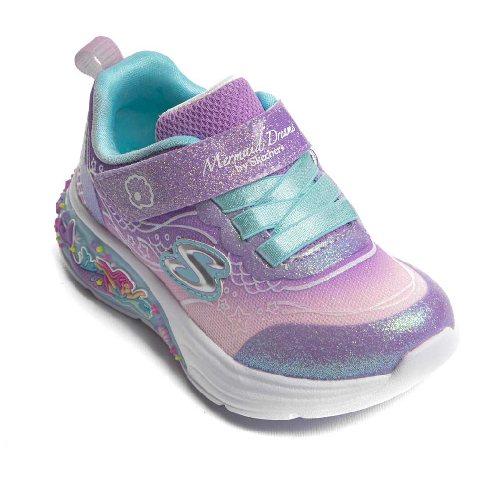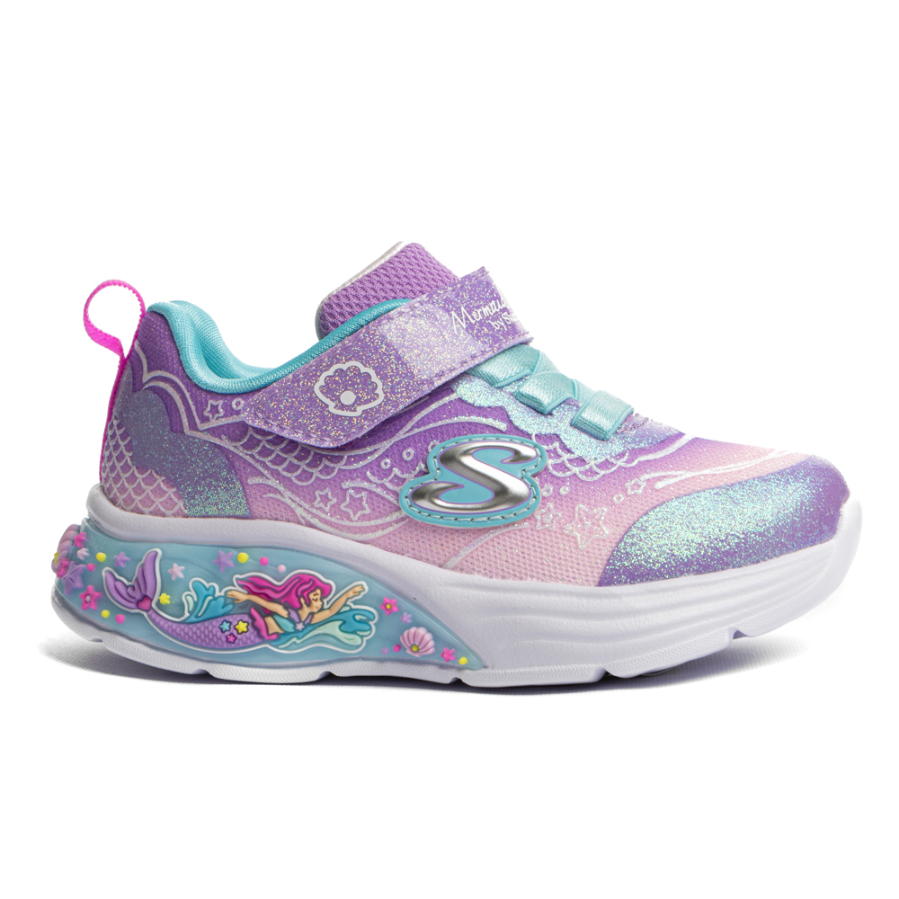 Skechers sneaker με αυτοκόλλητο και ελαστικά κορδόνια. Διαθέτει μια γοργόνα και φωτάκια στη σόλα. Το εσωτερικό αποτελείται από ύφασμα. Η εξωτερική σόλα αποτελείται από λάστιχο.