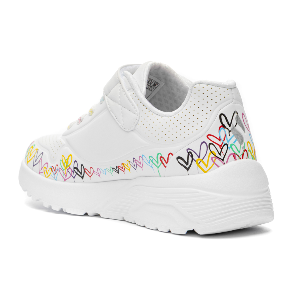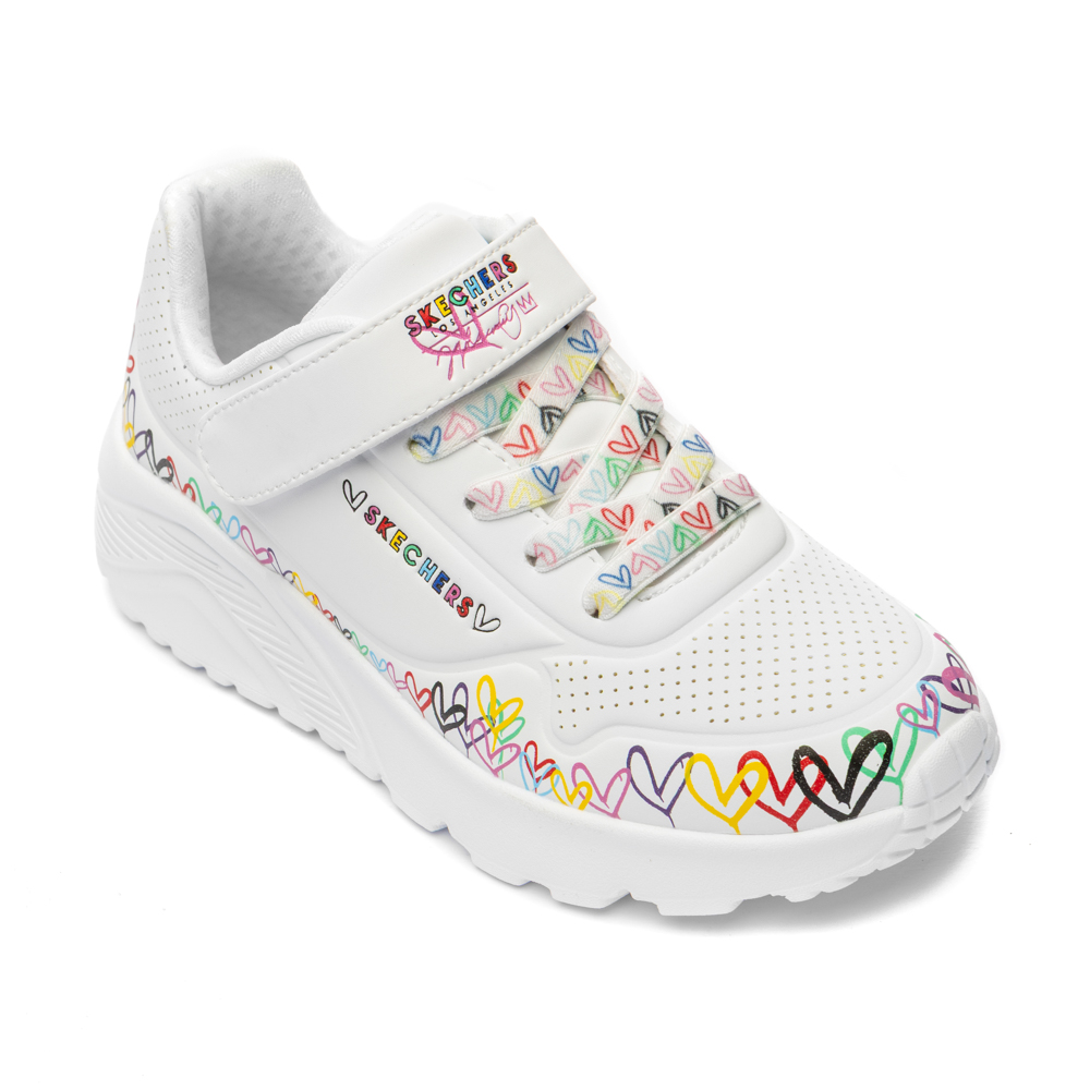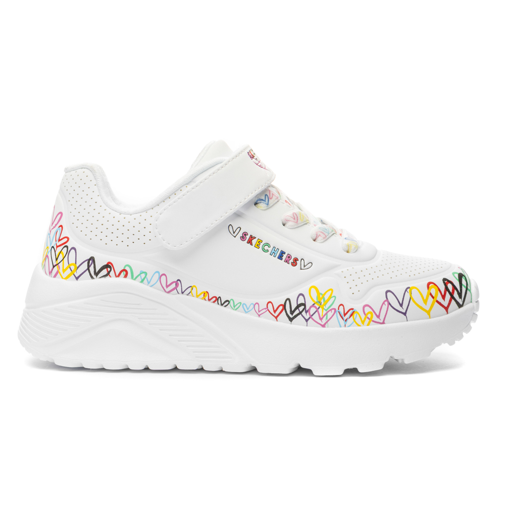 Skechers sneaker με αυτοκόλλητο και ελαστικά κορδόνια. Διαθέτει καρδιές περιμετρικά. Το εσωτερικό αποτελείται από ύφασμα. Η εξωτερική σόλα αποτελείται από λάστιχο.