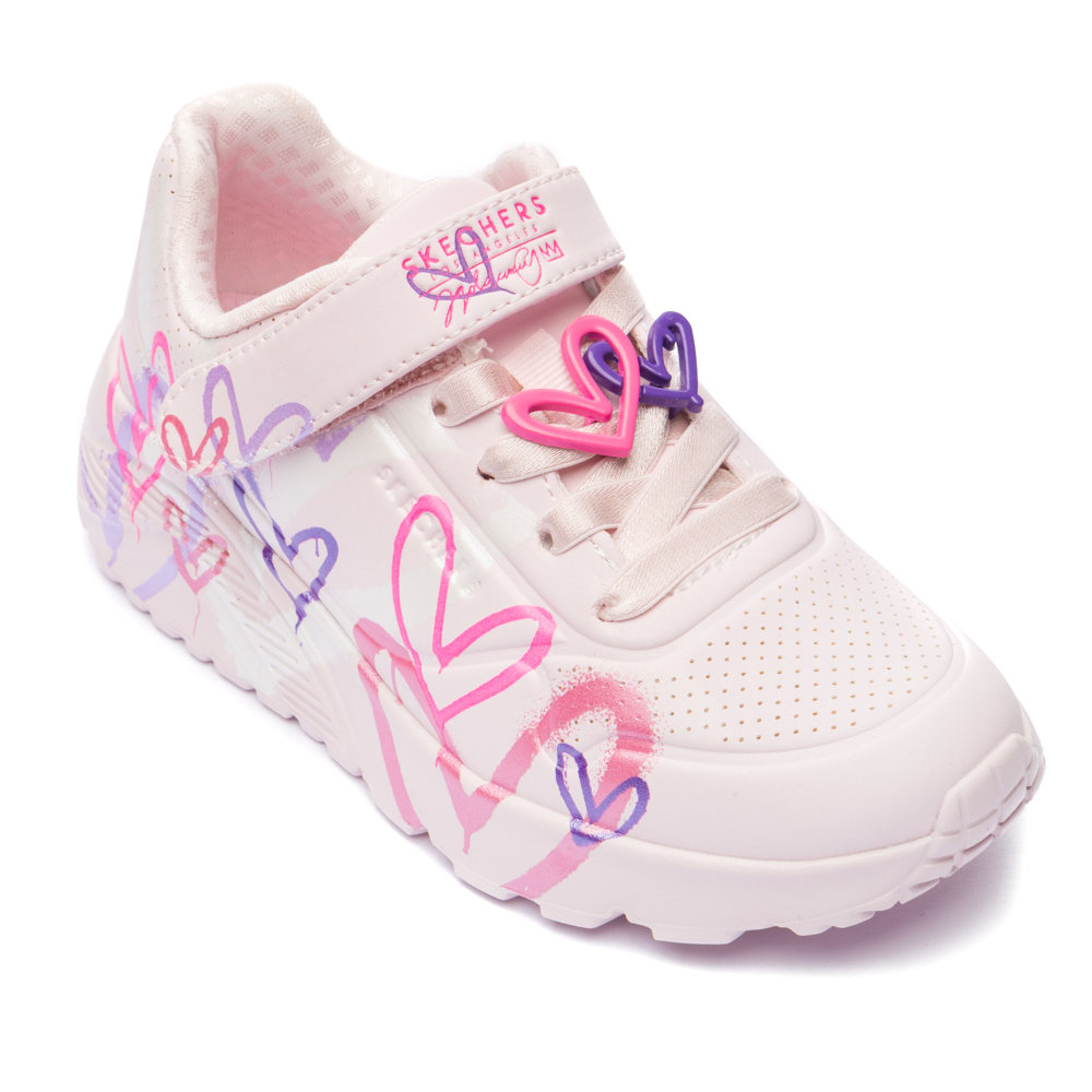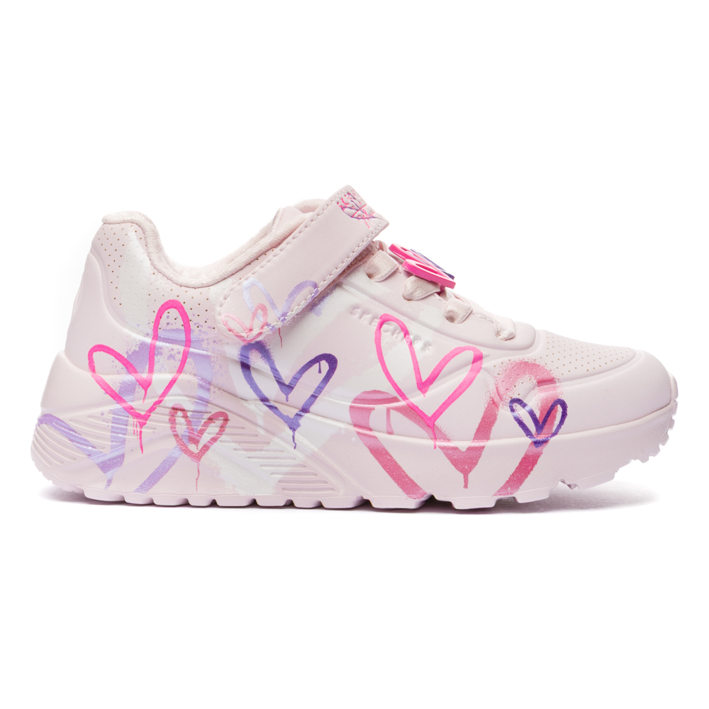 Skechers sneaker με αυτοκόλλητο και ελαστικά κορδόνια. Διαθέτει καρδιές περιμετρικά. Το εσωτερικό αποτελείται από ύφασμα. Η εξωτερική σόλα αποτελείται από λάστιχο.