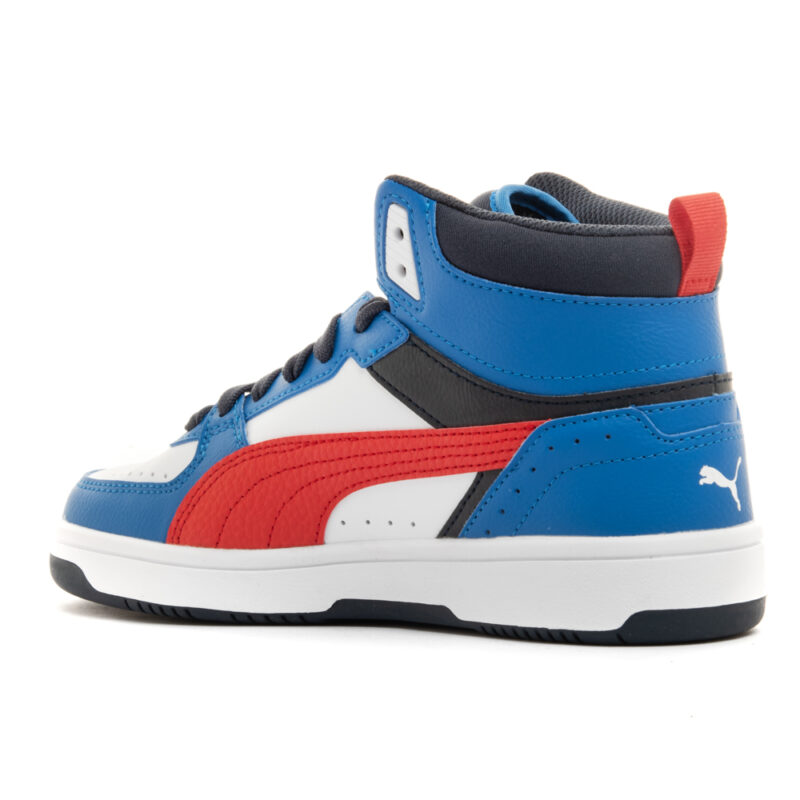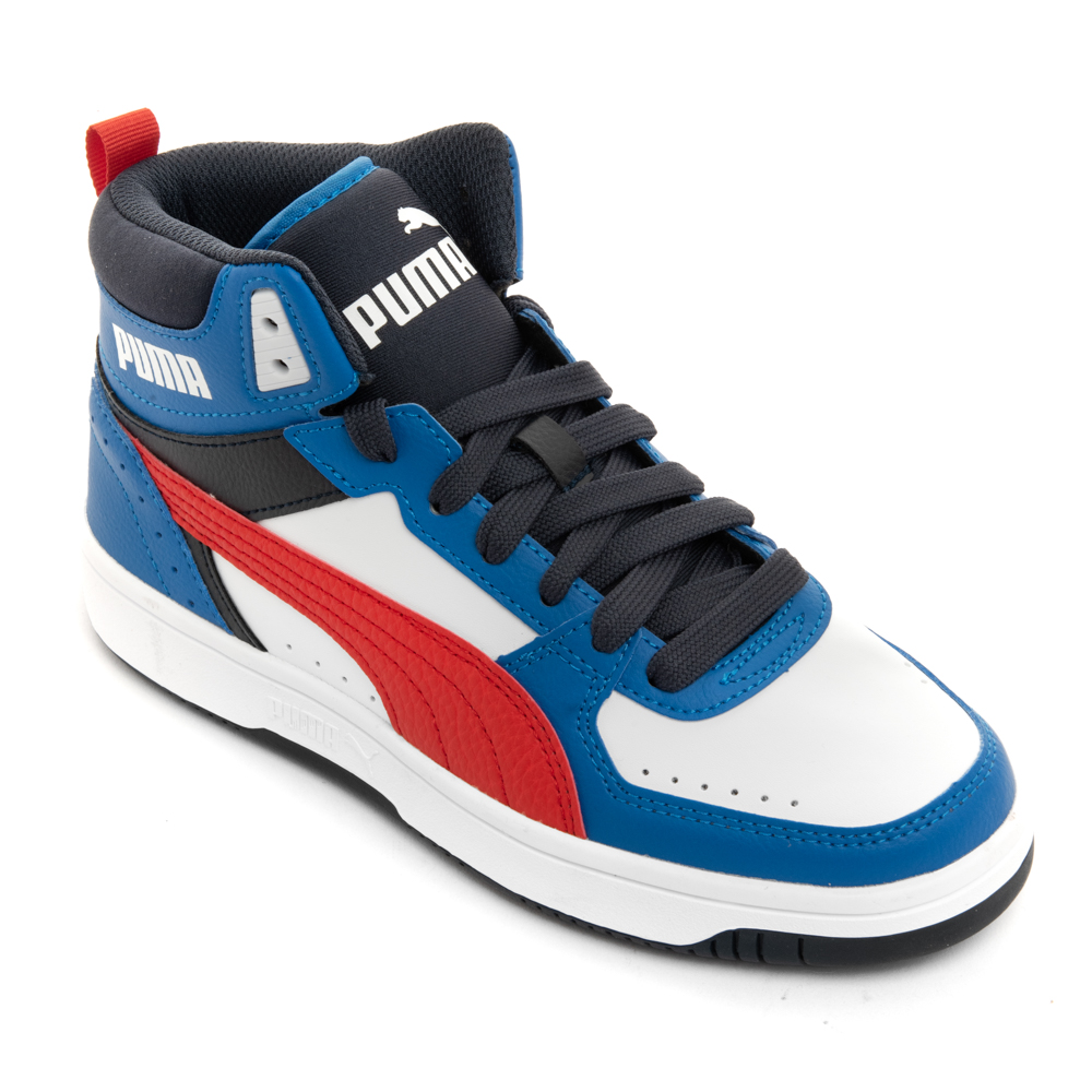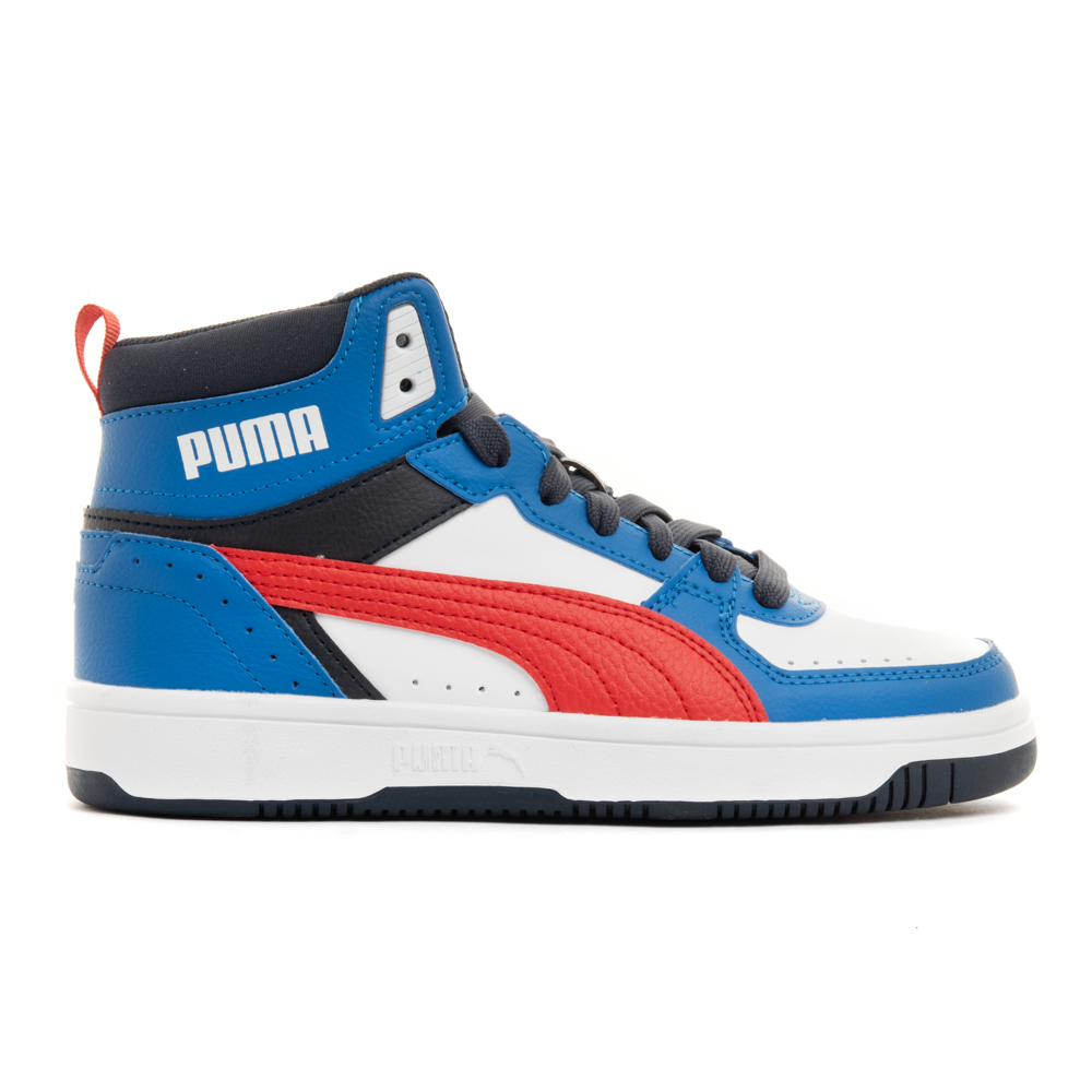 Puma Rebound μποτάκι με κορδόνια.Διαθέτει λευκές,μαύρες και κόκκινες λεπτομέρειες.Το εσωτερικό αποτελείται από ύφασμα και υφασμάτινο πατάκι.Η εξωτερική σόλα αποτελείται από λάστιχο.