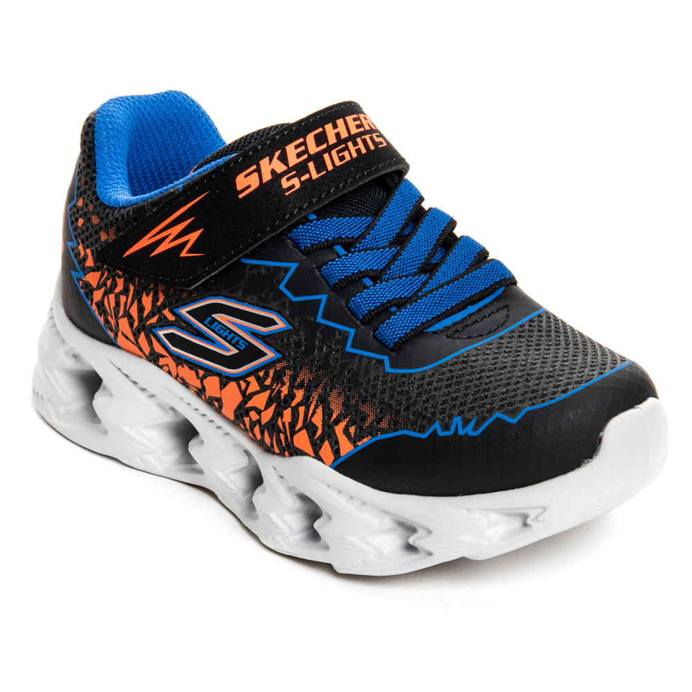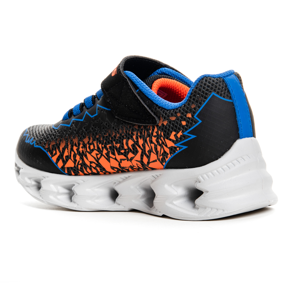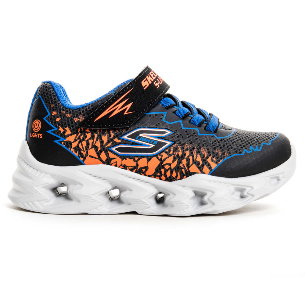 Skechers sneaker με αυτοκόλλητο και ελαστικά κορδόνια. Διαθέτει κίτρινες και μπλε λεπτομέρειες και φωτάκια στη σόλα. Το εσωτερικό αποτελείται από ύφασμα. Η εξωτερική σόλα αποτελείται από λάστιχο.