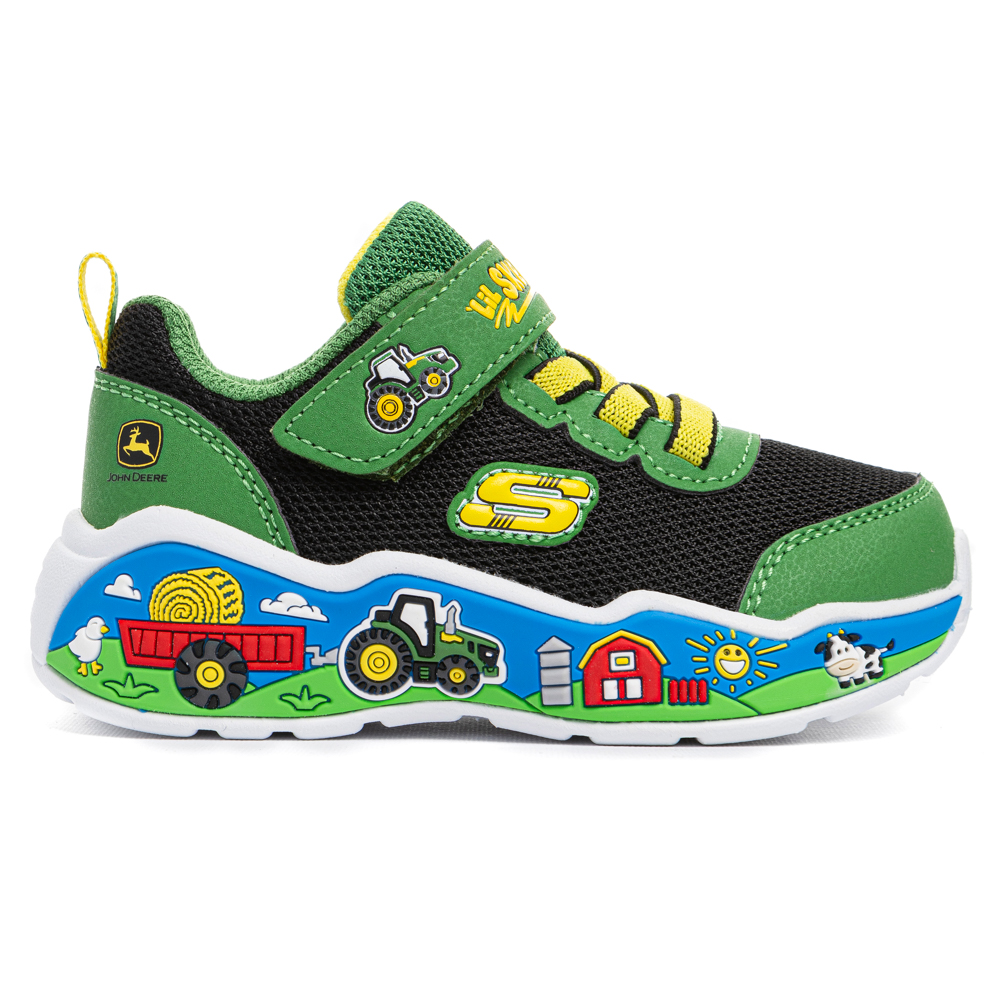 Skechers sneaker με αυτοκόλλητο και ελαστικά κορδόνια. Διαθέτει John Deere μηχανήματα. Το εσωτερικό αποτελείται από ύφασμα. Η εξωτερική σόλα αποτελείται από λάστιχο.