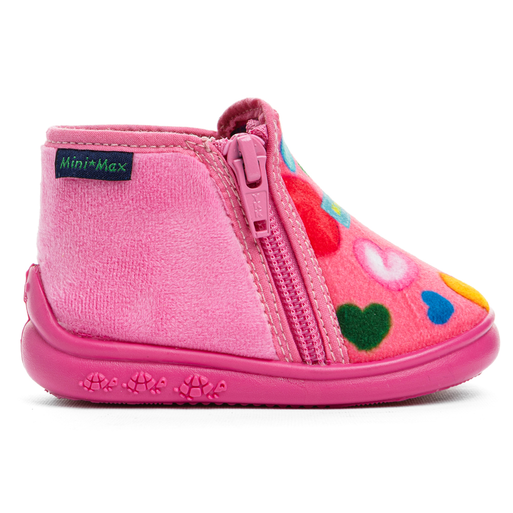 Mini Max παντοφλάκι με φερμουάρ. Διαθέτει καρδούλες περιμετρικά. Το εσωτερικό αποτελείται από ύφασμα και δερμάτινο,ανατομικό πατάκι. Η εξωτερική σόλα αποτελείται από λάστιχο.