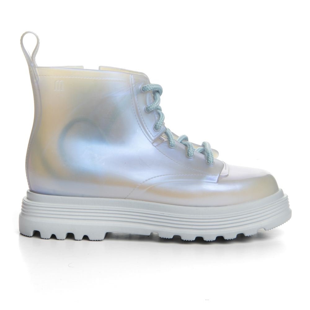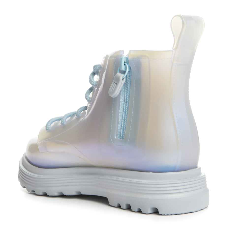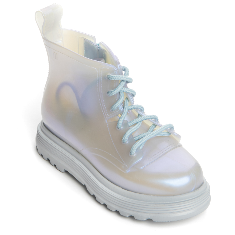 Mini Melissa μποτάκι με κορδόνια. Το εσωτερικό αποτελείται από λάστιχο και υφασμάτινο πατάκι. Η εξωτερική σόλα αποτελείται από λάστιχο.