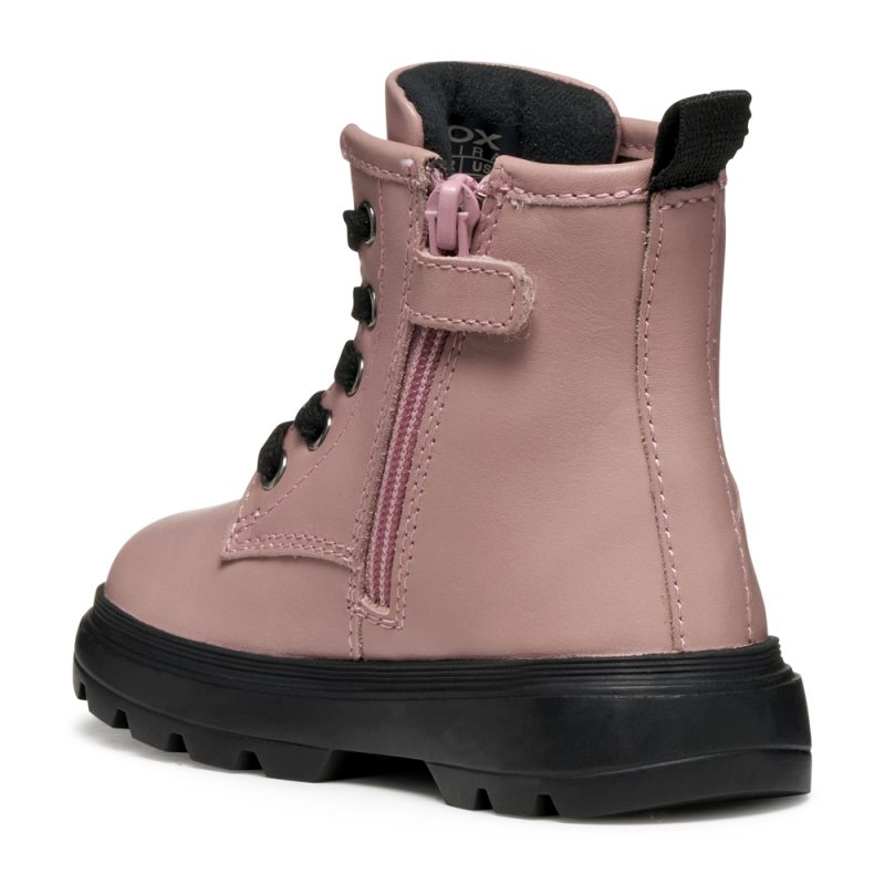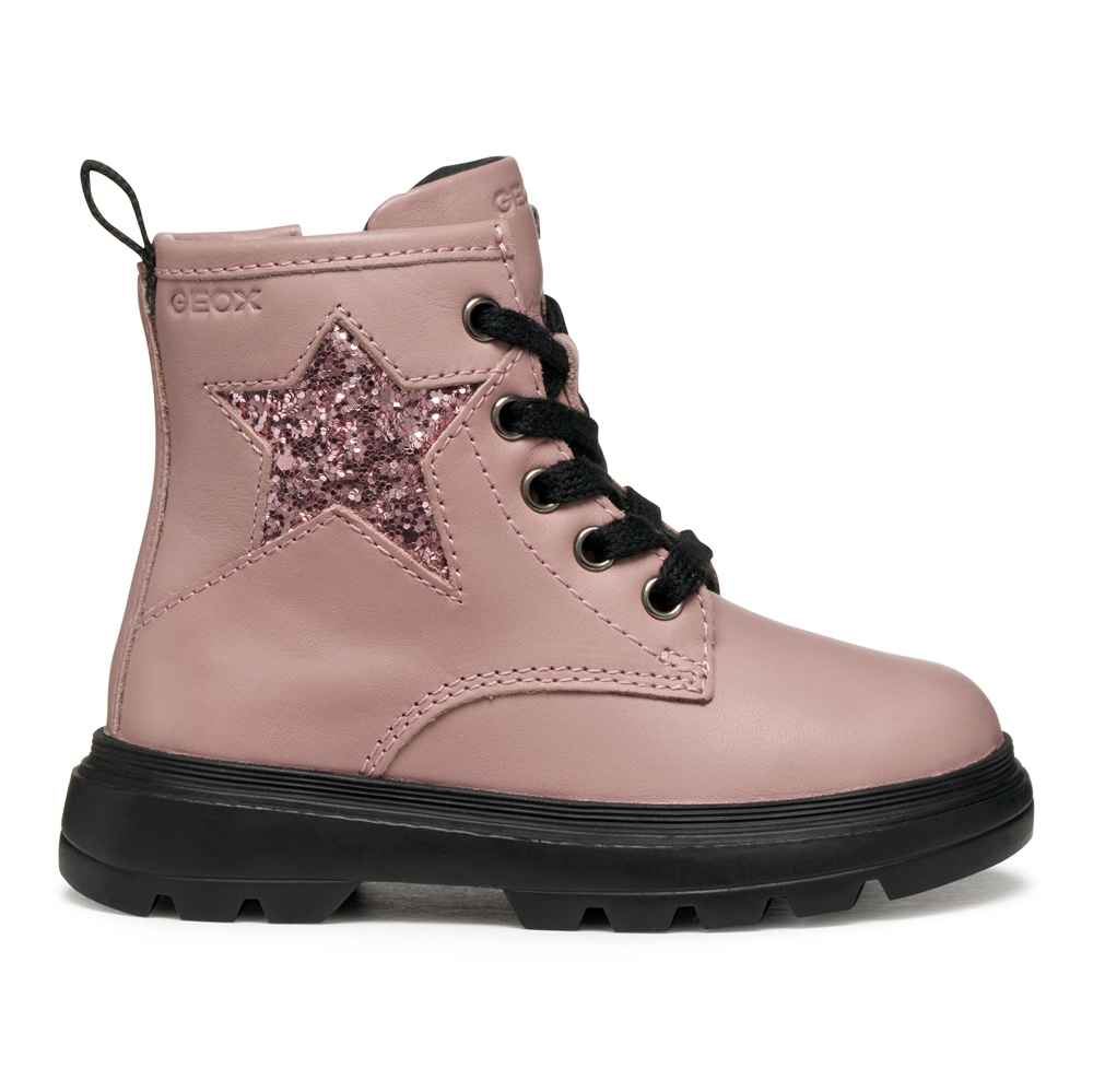Geox μποτάκι με κορδόνια και φερμουάρ στο πλάι. Διαθέτει ένα αστέρι στο πλάι. Το εσωτερικό αποτελείται από ύφασμα και δερμάτινο,ανατομικό,αντιβακτηριακό πατάκι. Η εξωτερική σόλα αποτελείται από λάστιχο.