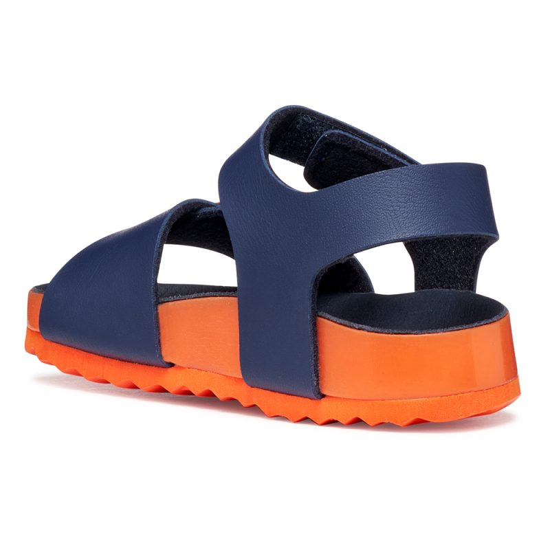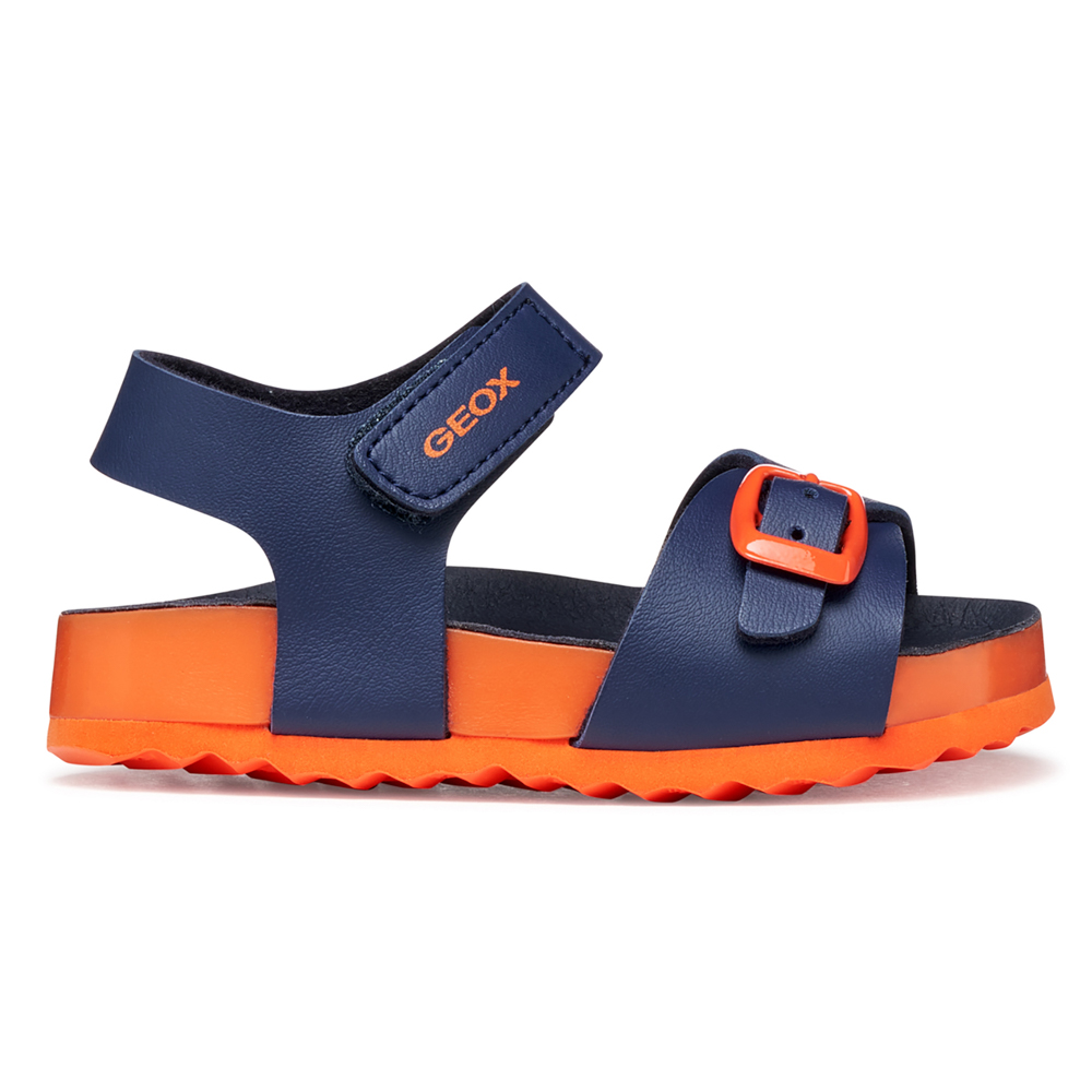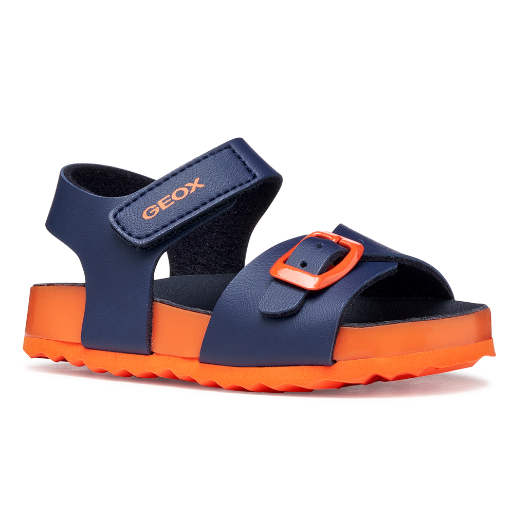 Geox πέδιλο με αυτοκόλλητο. Το εσωτερικό αποτελείται από δέρμα και δερμάτινο,ανατομικό,αντιβακτηριακό πατάκι. Η εξωτερική σόλα αποτελείται από λάστιχο.