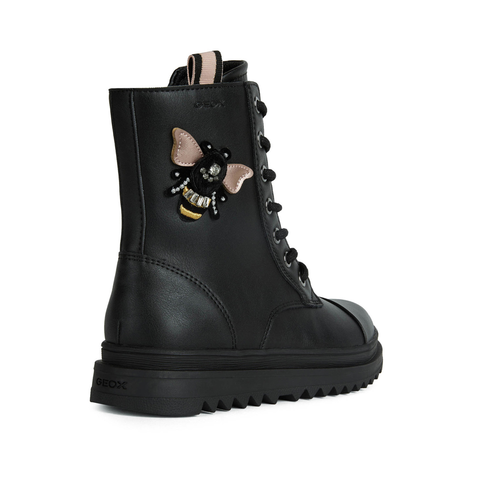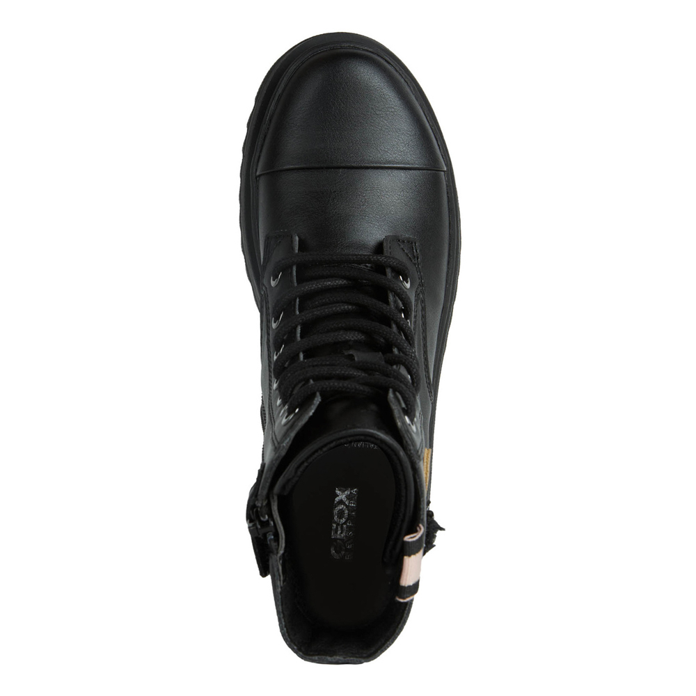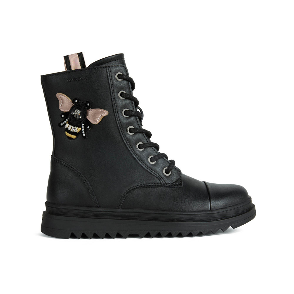 Geox αρβυλάκι με κορδόνια και φερμουάρ.Διαθέτει μια μέλισσα στο πλάι.Το εσωτερικό αποτελείται από ύφασμα και υφασμάτινο πατάκι υψηλής αναπνευστότητας.Η εξωτερική σόλα αποτελείται από λάστιχο.