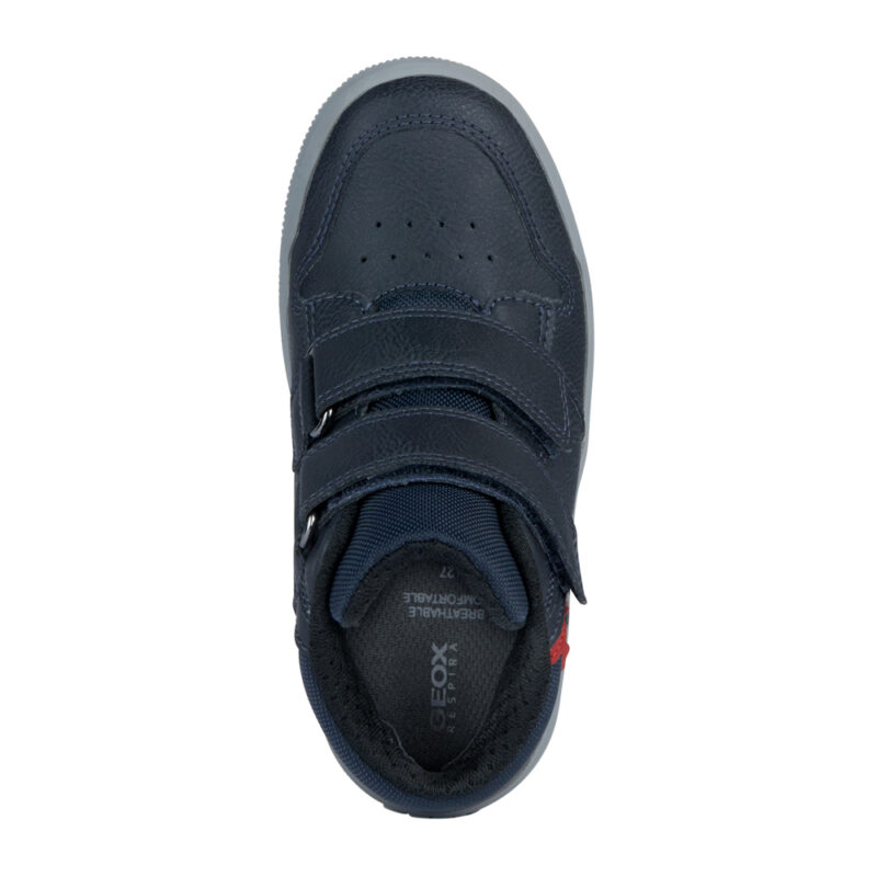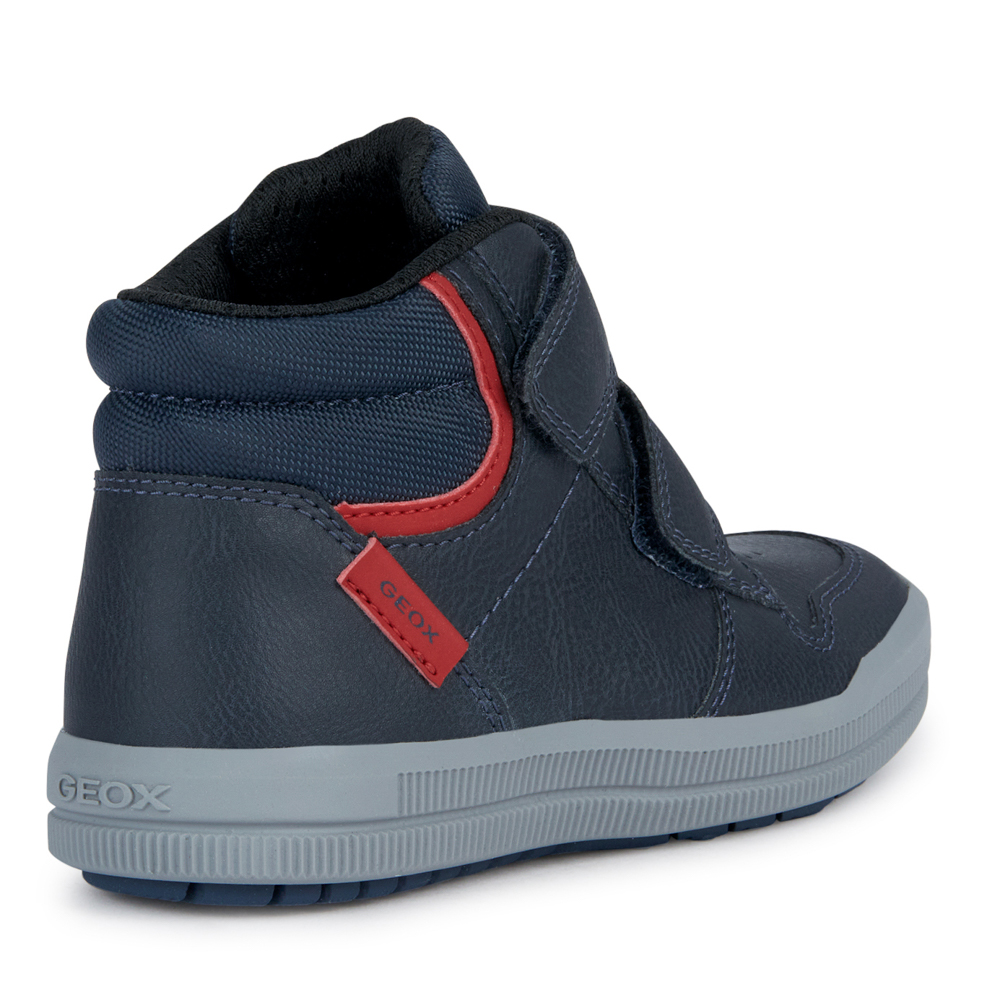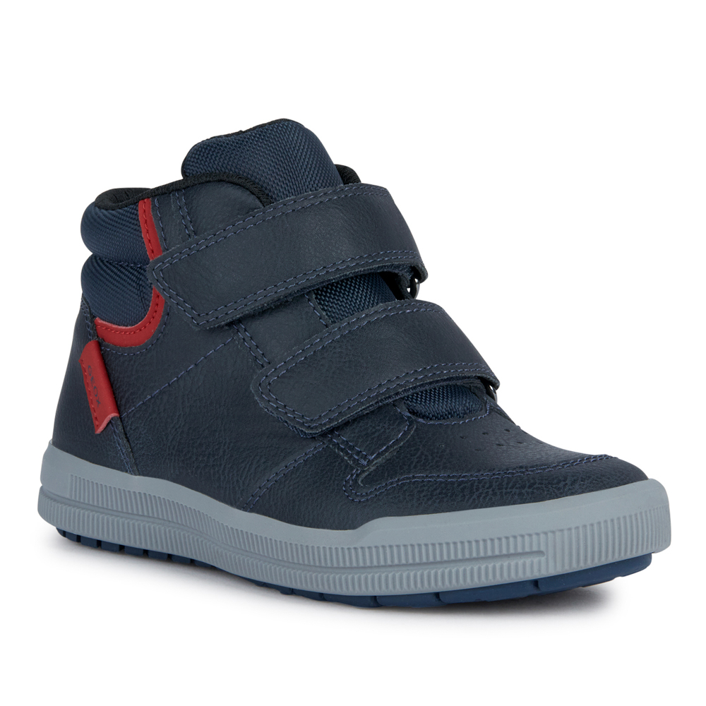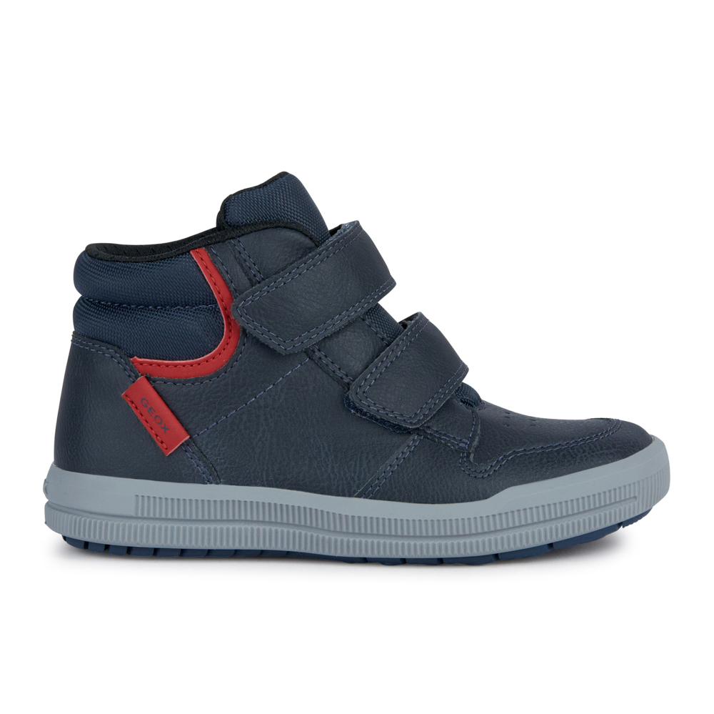 Geox μποτάκι Arzach με δύο αυτοκόλλητα.Διαθέτει κόκκινες λεπτομέρειες.Το εσωτερικό αποτελείται από ύφασμα και υφασμάτινο πατάκι.Η εξωτερική σόλα αποτελείται από λάστιχο.