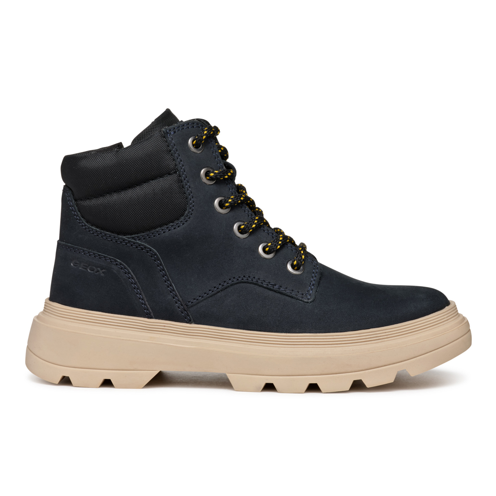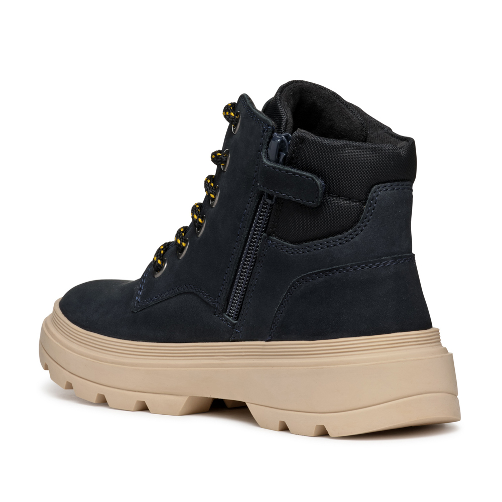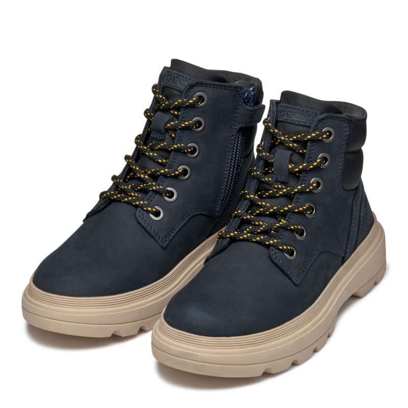 Geox μποτάκι με κορδόνια και φερμουάρ. Διαθέτει κίτρινες λεπτομέρειες στα κορδόνια. Το εσωτερικό αποτελείται από ύφασμα και μάλλινο πατάκι. Η εξωτερική σόλα αποτελείται από λάστιχο.