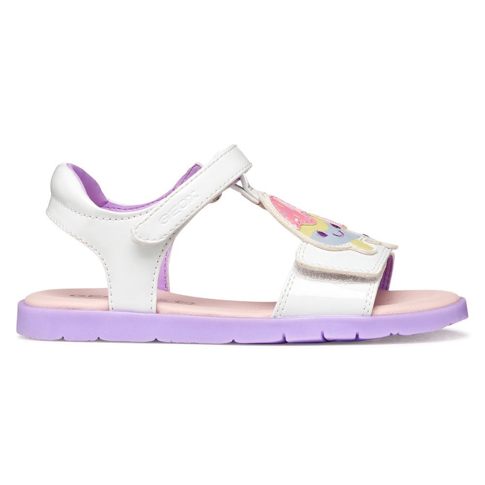 Geox πέδιλο με αυτοκόλλητα. Διαθέτει ένα παγωτό μπροστά. Το εσωτερικό αποτελείται από δέρμα. Η εξωτερική σόλα αποτελείται από λάστιχο.