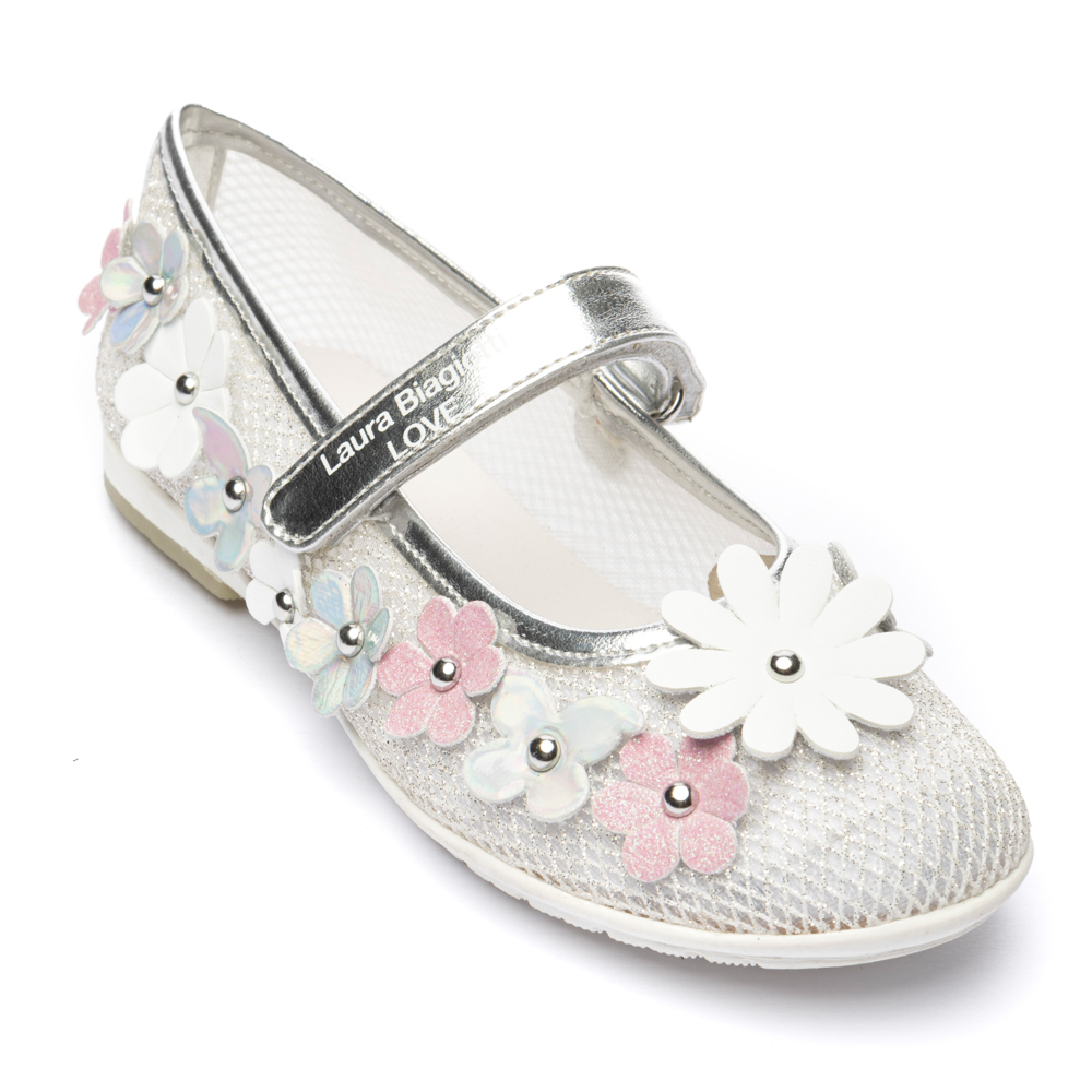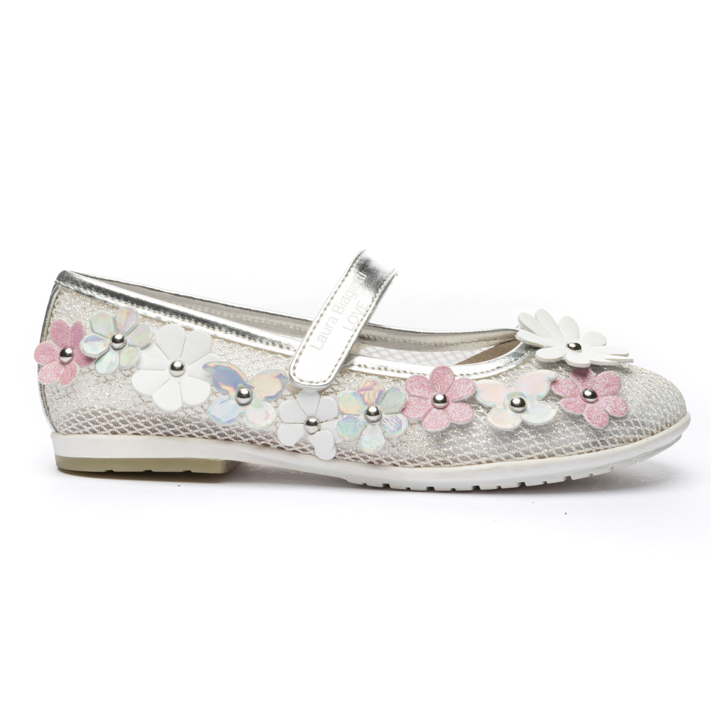 Laura Biagiotti μπαρέτα με αυτοκόλλητο. Διαθέτει λουλούδια περιμετρικά. Το εσωτερικό αποτελείται από ύφασμα. Η εξωτερική σόλα αποτελείται από λάστιχο.