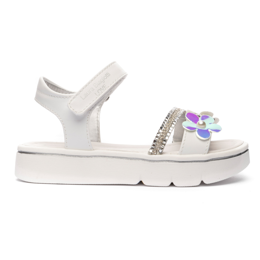 Laura Biagiotti πέδιλο με αυτοκόλλητο. Διαθέτει στρας και ένα λουλούδι στο μπροστά μέρος. Το εσωτερικό αποτελείται από δέρμα και δερμάτινο,ανατομικό πατάκι. Η εξωτερική σόλα αποτελείται από λάστιχο.