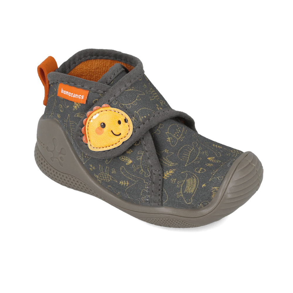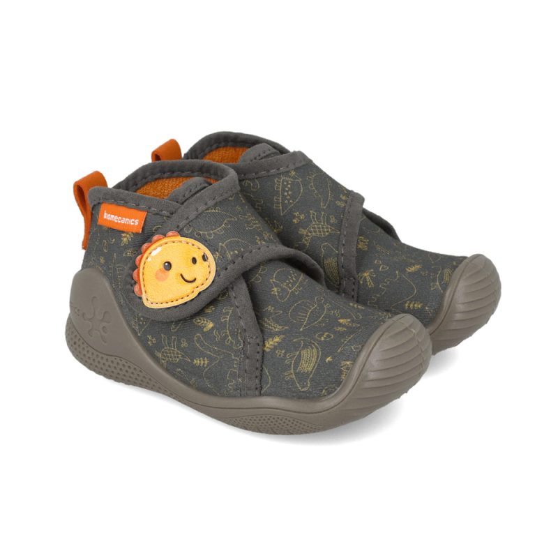 Biomecanics slipper with velcro. It features dinosaurs around the surface. The inner part consists of textile and a leather,anatomic,antibacterial insole. The outsole consists of rubber.