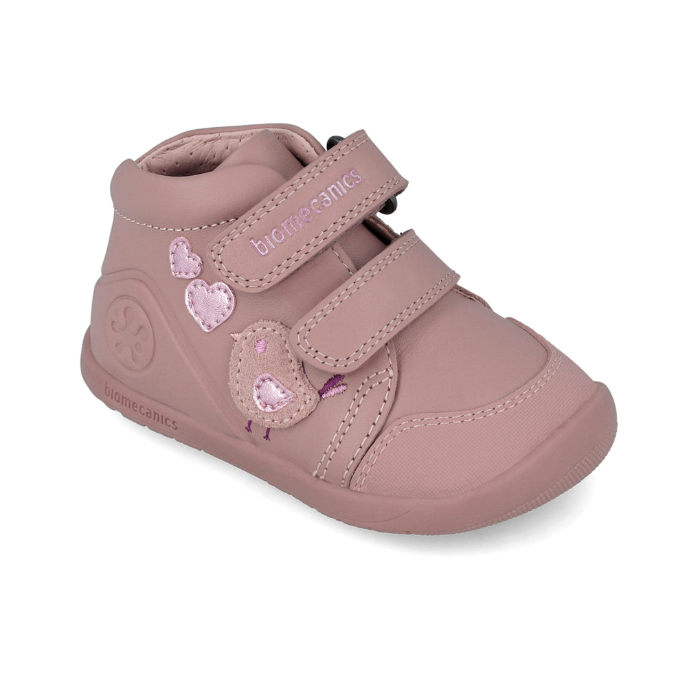 Biomecanics boot with velcro. It features a bird and little hearts on the side. The inner part consists of leather and a leather,anatomic,antibacterial insole. The outsole consists of rubber.