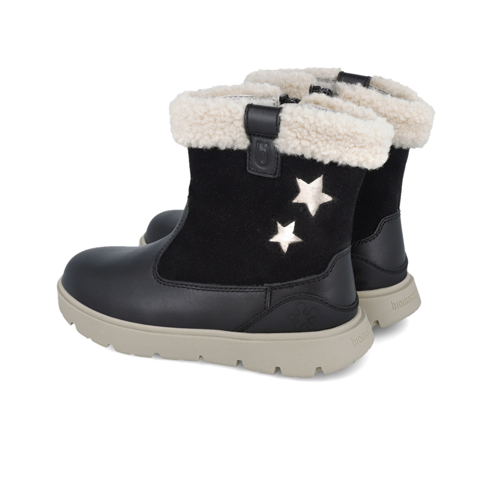 Biomecanics boot with zipper. It features fur on top and stars on the side. The inner part consists of leather and a leather,anatomic,antibacterial insole. The outsole consists of rubber.