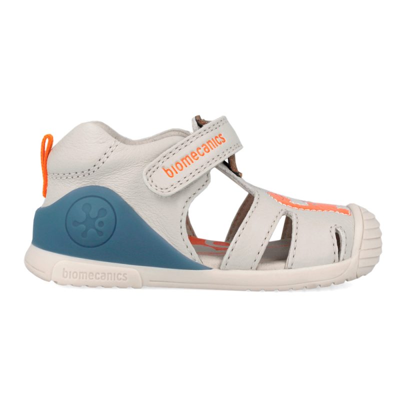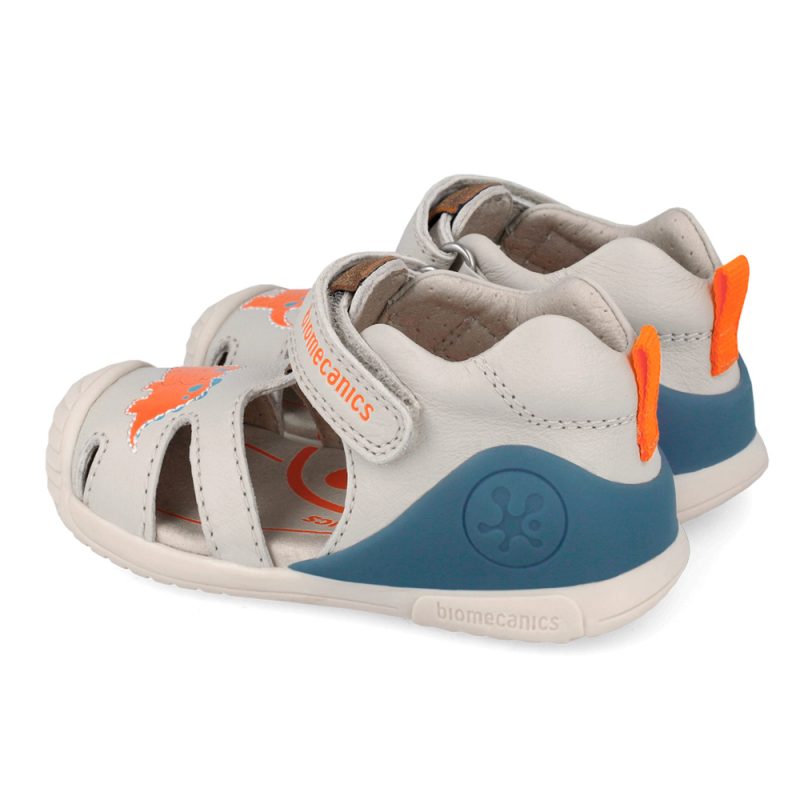 Biomecanics sandal with velcro. This sandal is specifically designed for the first steps. The inner part consists of leather and a leather,anatomic,antibacterial insole with a very stable structure on the ankle. The outsole consists of rubber.