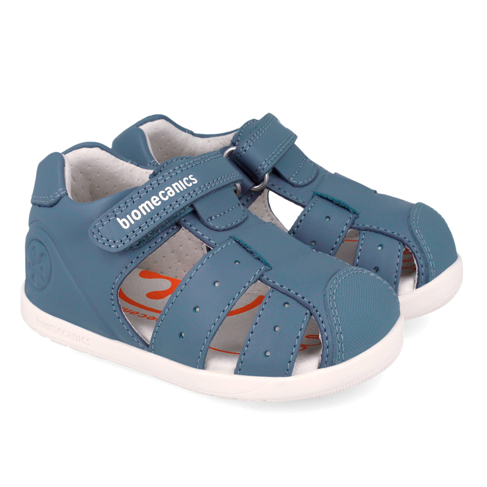 Biomecanics sandal with velcro. This sandal is specifically designed for the first steps. The inner part consists of leather and a leather,anatomic,antibacterial insole with a very stable structure on the ankle. The outsole consists of rubber.
