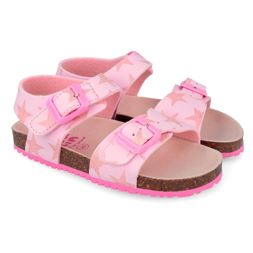 Garvalin sandal with velcro. It features stars around the surface. The inner part consists of textile and a leather,anatomic insole. The outsole consists of rubber.