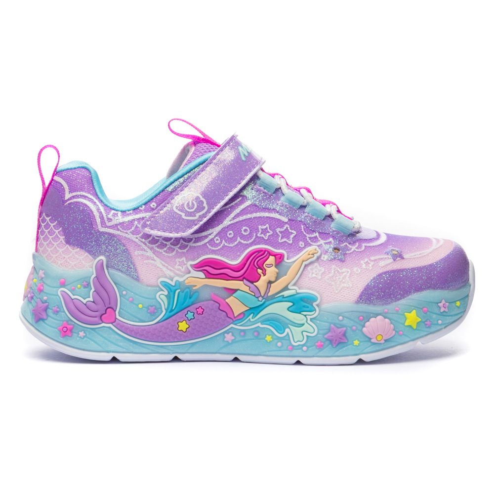 Skechers sneaker with velcro. It features a mermaid on the side and lights in the outsole. The inner part consists of textile. The outsole consists of rubber.