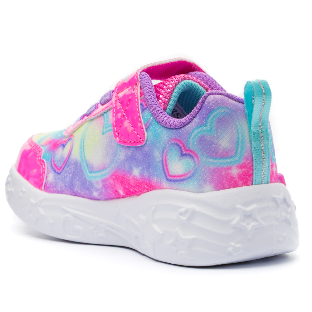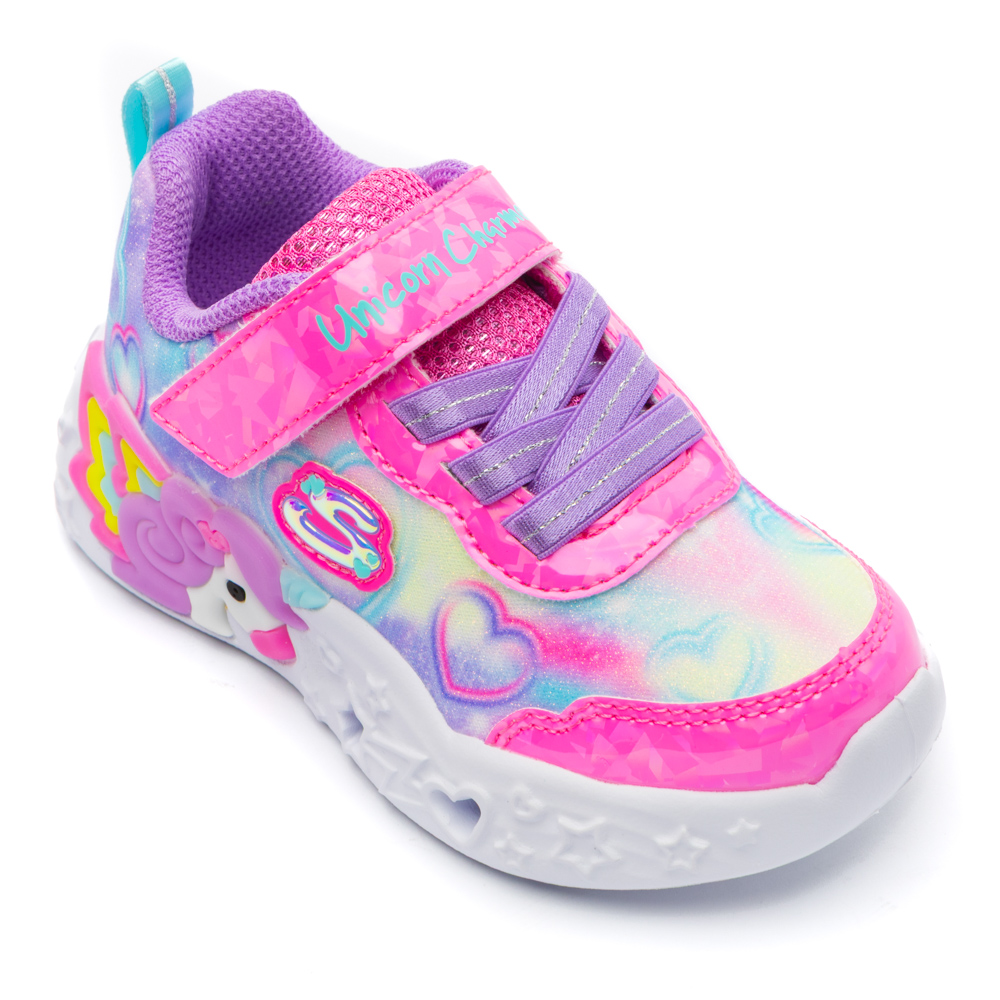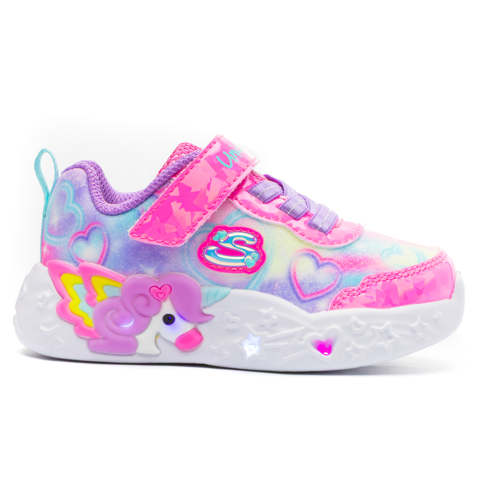 Skechers sneaker with velcro and elastic laces. It features a unicorn on the side and lights in the outsole. The inner part consists of textile. The outsole consists of rubber.