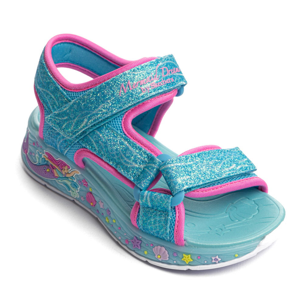 Skechers sandal with velcro. It features a mermaid on the side and lights in the outsole.