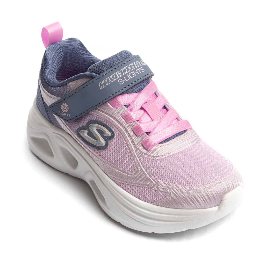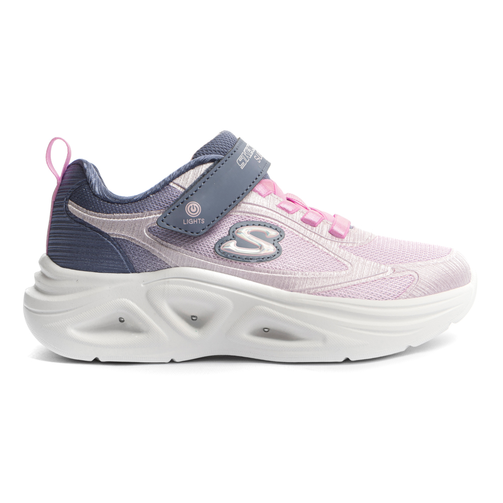 Skechers trainer with velcro and elastic laces. It features lights in the outsole. The inner part consists of textile. The outsole consists of rubber.