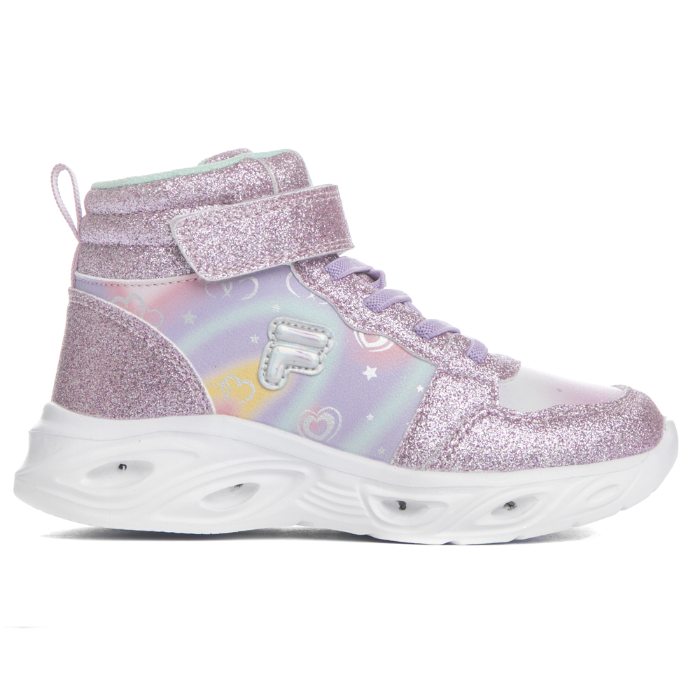 Fila Memory Wizard with velcro and elastic laces. It features lights in the outsole and glitter around the surface. The inner part consists of textile. The outsole consists of rubber.