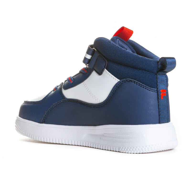 Fila Memory Ayo with velcro and elastic laces.It features white and red details.The inner part consists of textile and a textile insole.The outsole consists of rubber.