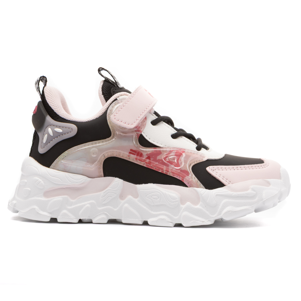 Fila Memory Musha with velcro and elastic laces. It features pink details. The inner part consists of textile. The outsole consists of rubber.