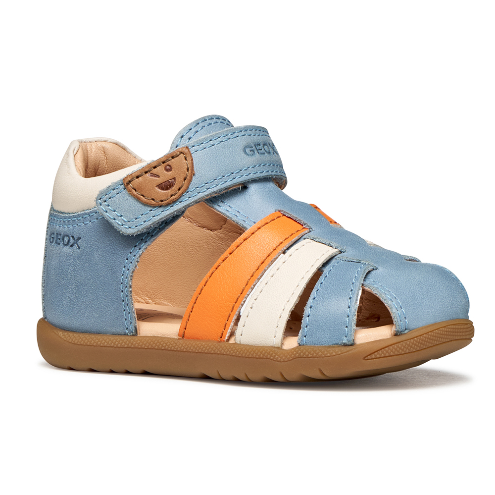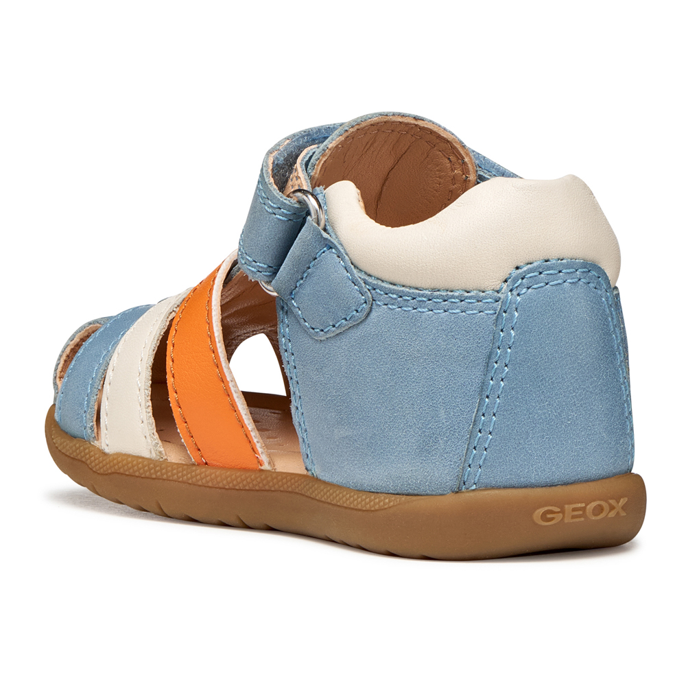 Geox sandal with velcro. It features orange and white details. The inner part consists of leather and a leather,anatomic,antibacterial insole. The outsole consists of rubber.