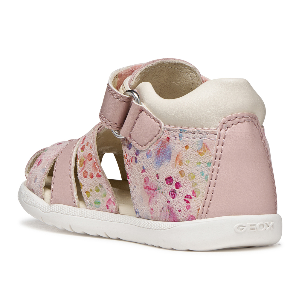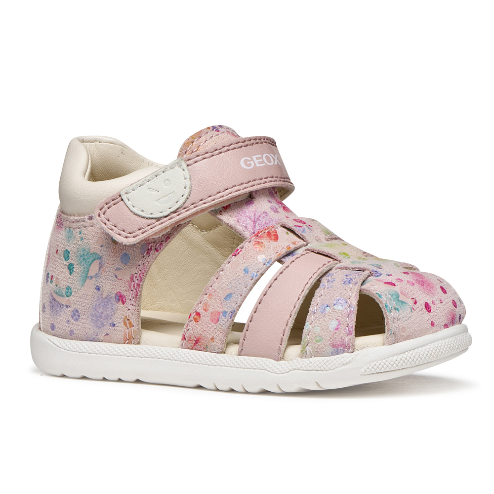 Geox sandal with velcro. It features multicolor details around the surface. The inner part consists of leather and a leather,anatomic, antibacterial insole. The outsole consists of rubber.