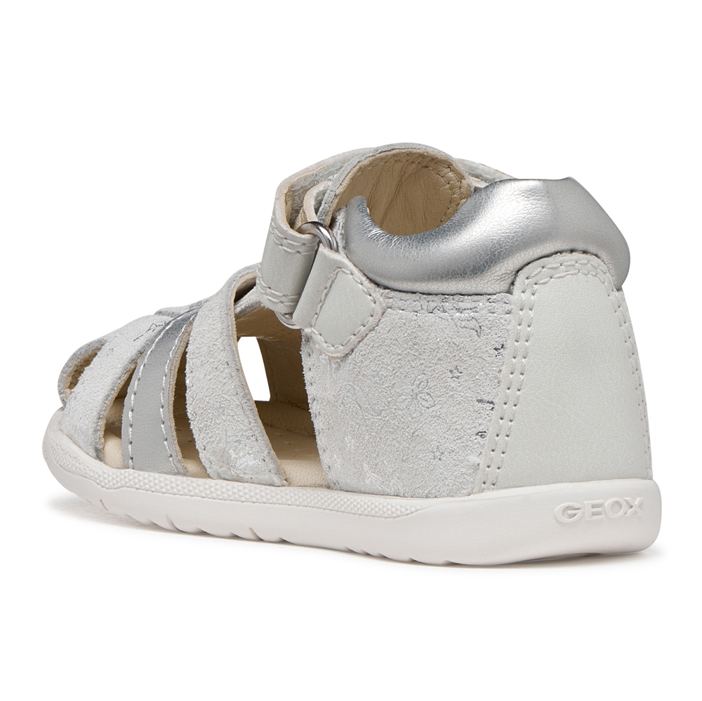 Geox sandal with velcro. It features silver details. The inner part consists of leather and a leather,anatomic,antibacterial insole. The outsole consists of rubber.
