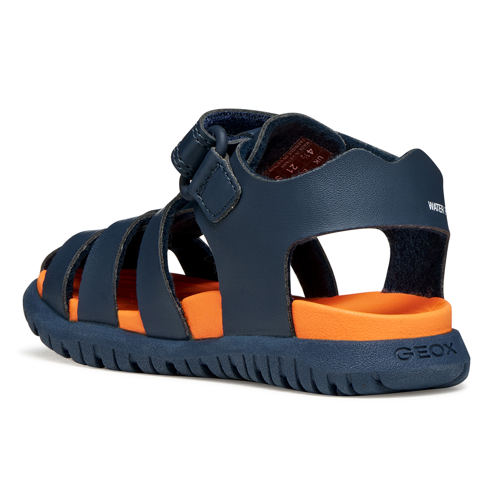 Geox sandal with velcro. It features orange details. The inner part consists of textile. The outsole consists of rubber.