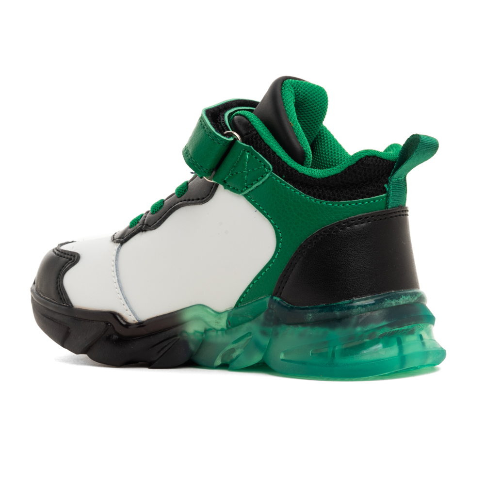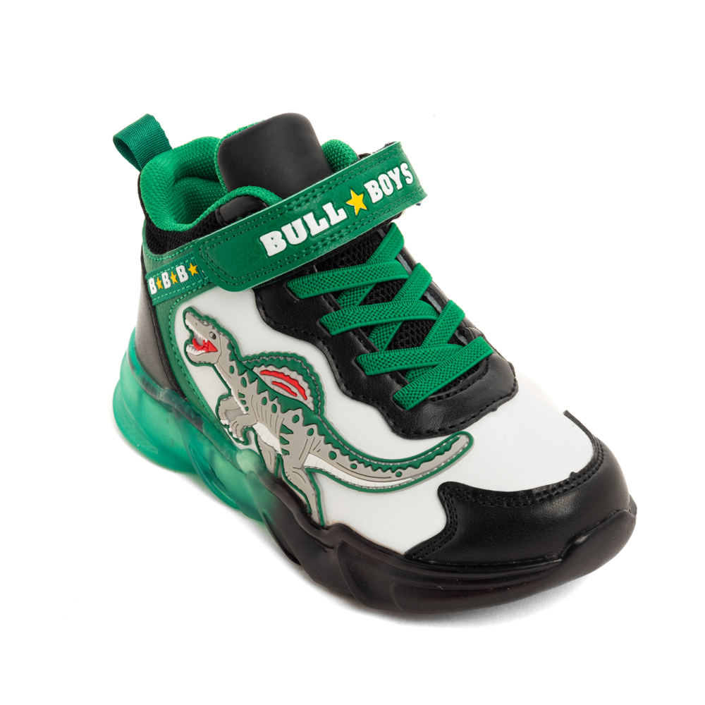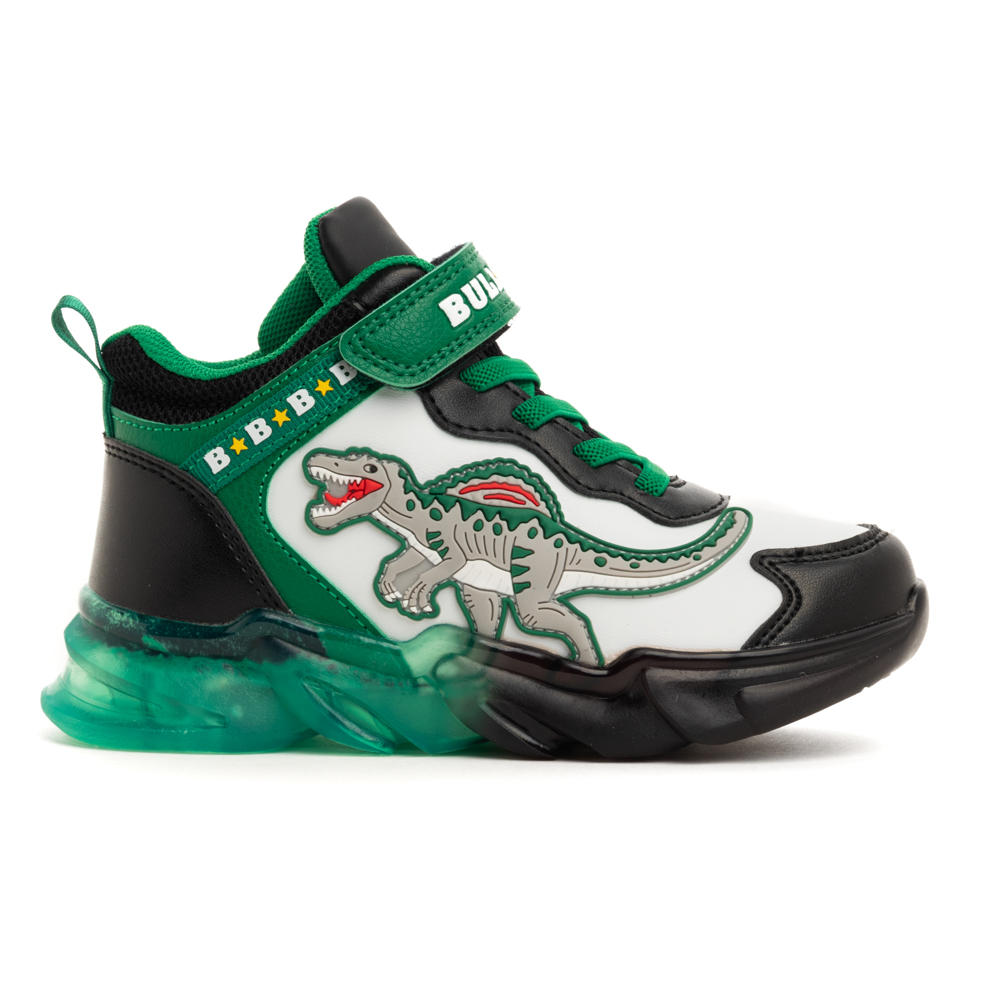 Bull Boys boot with velcro and elastic laces.It features a dinosaur on the side and lights in the outsole.The inner part consists of textile and a textile insole.The outsole consists of rubber.