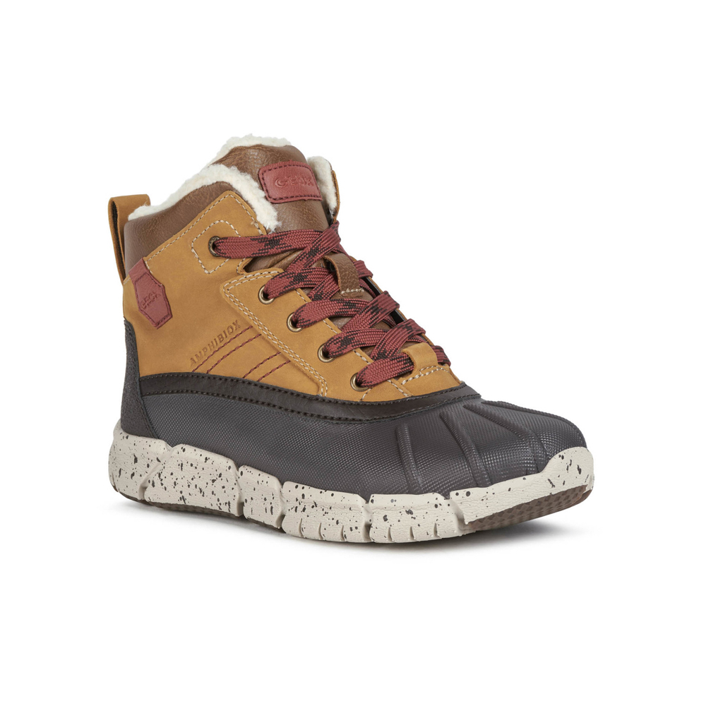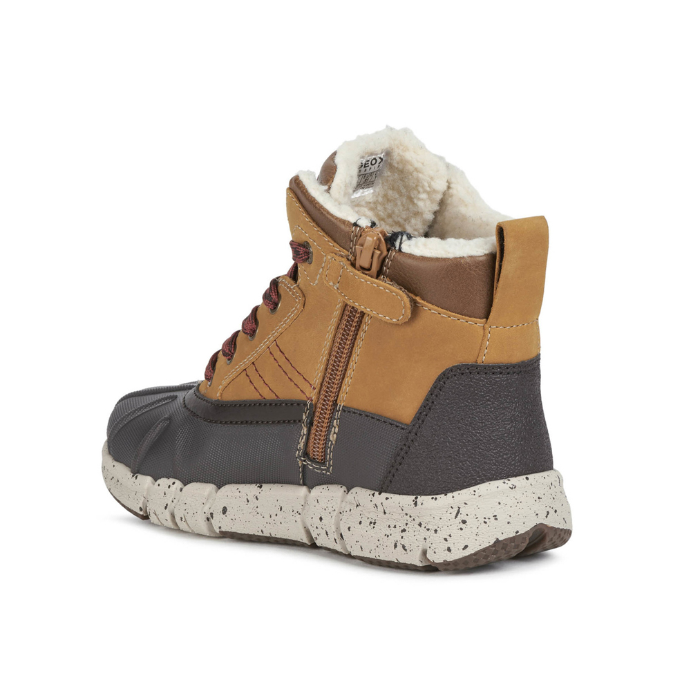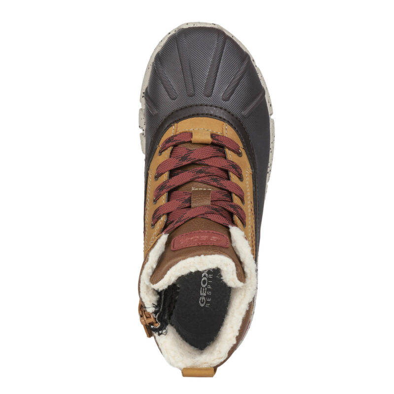 Geox waterproof boot with laces and zipper.It features fur on the top.The inner part consists of textile and a textile,waterproof insole.The outsole consists of on-slip rubber.