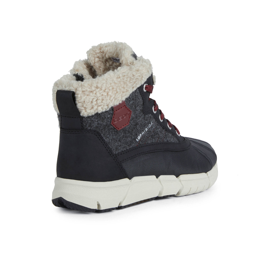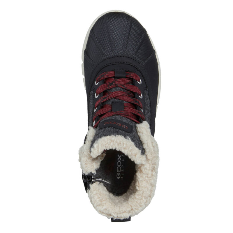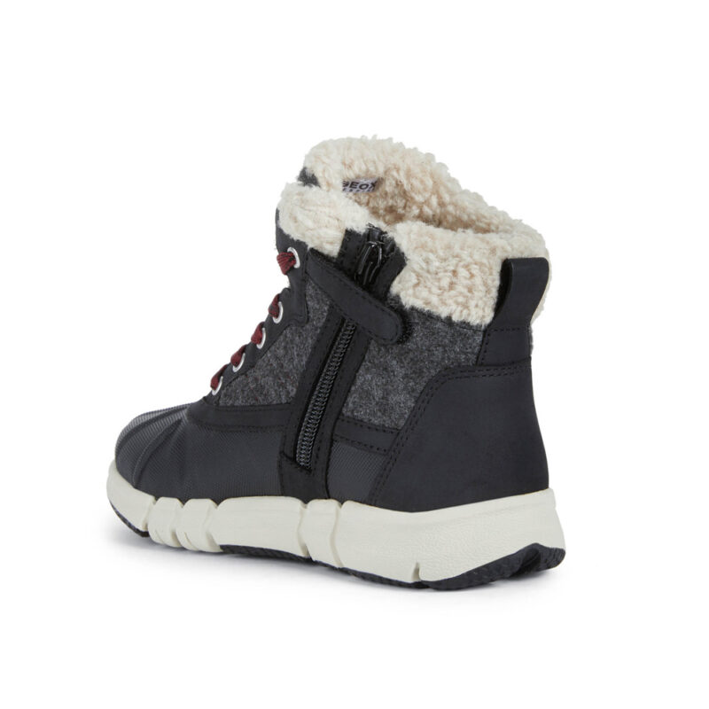 Geox waterproof boot with laces and zipper.It features fur on the top.The inner part consists of textile and a textile,waterproof insole.The outsole consists of on-slip rubber.