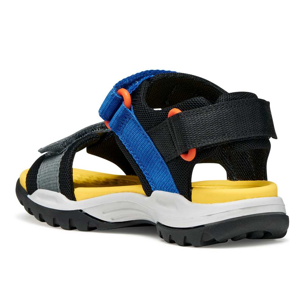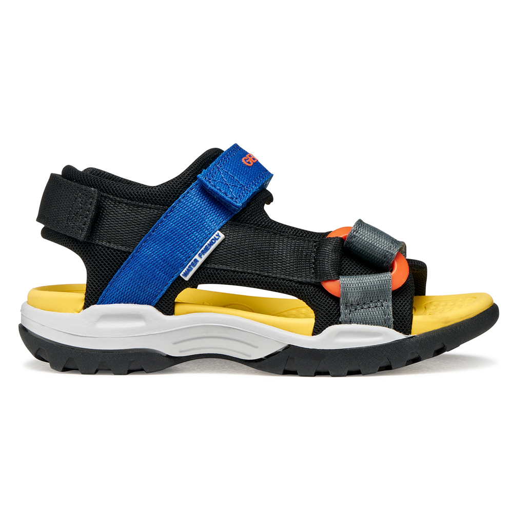 Geox sandal with velcro. It features blue and yellow details. The inner part consists of textile. The outsole consists of rubber.