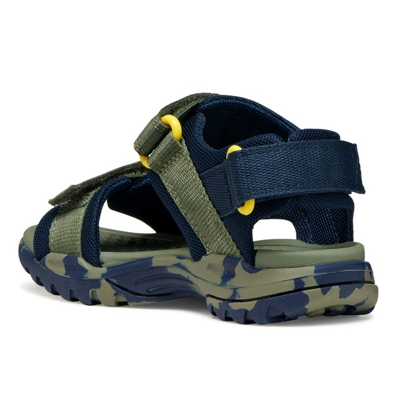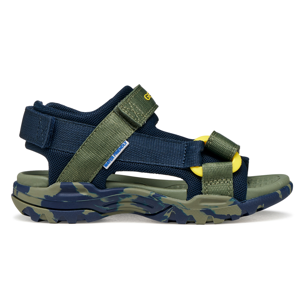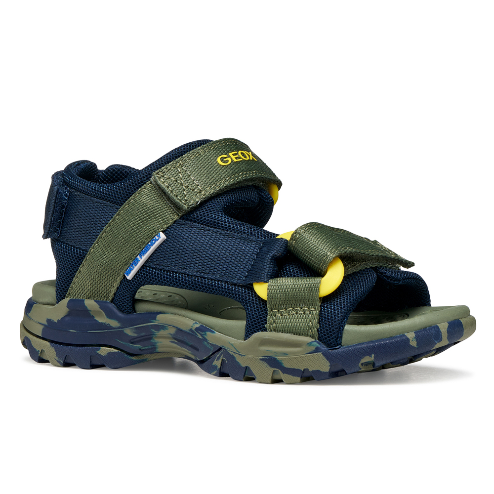 Geox sandal with velcro. It features green details. The inner part consists of textile. The outsole consists of rubber.