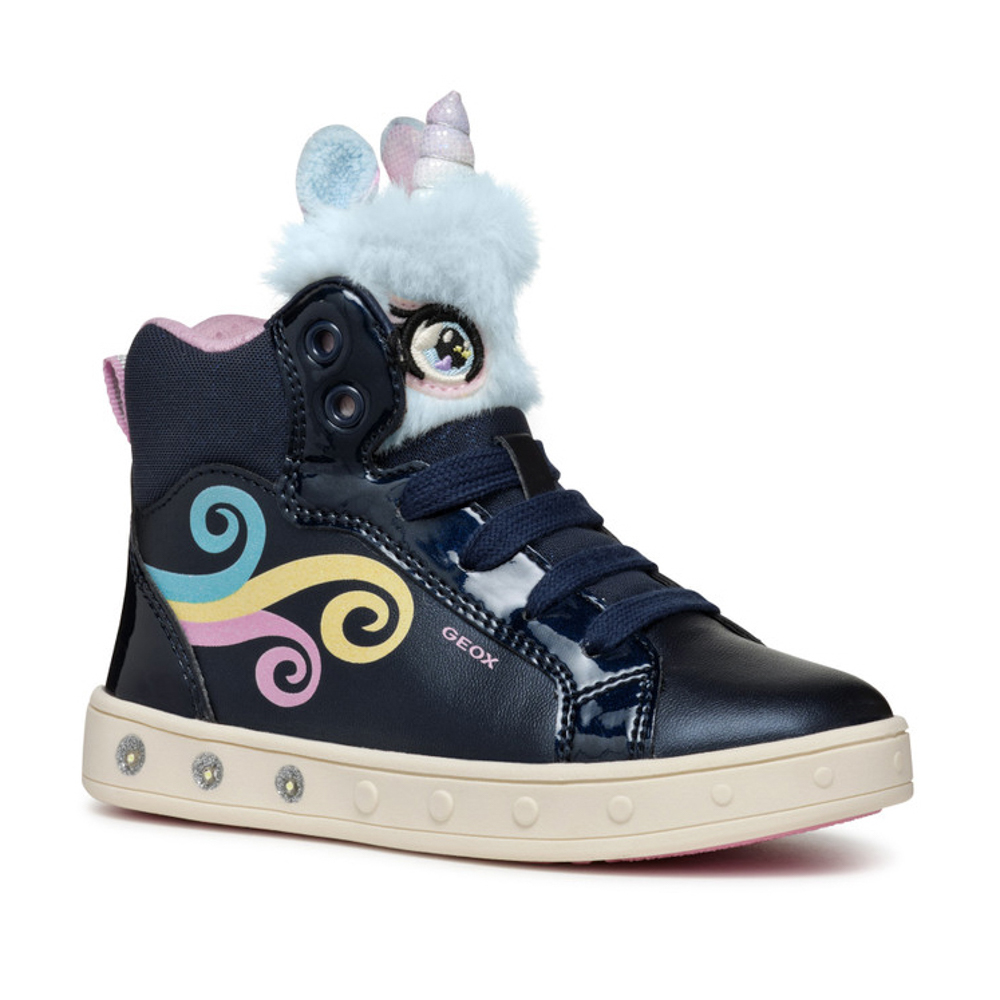 Geox boot with laces and zipper. It features a unicorn and lights in the outsole. The inner part consists of textile and a textile insole. The outsole consists of rubber.