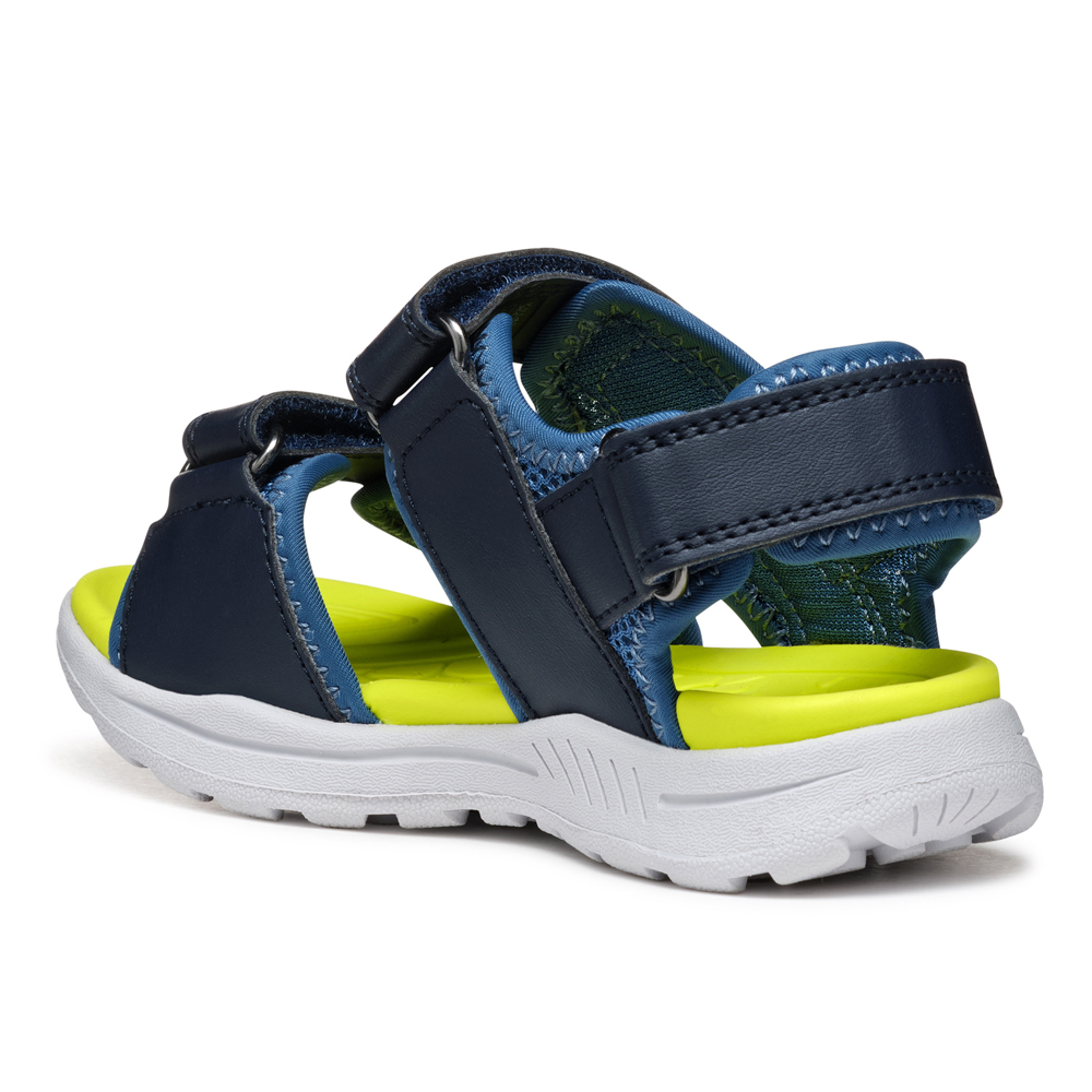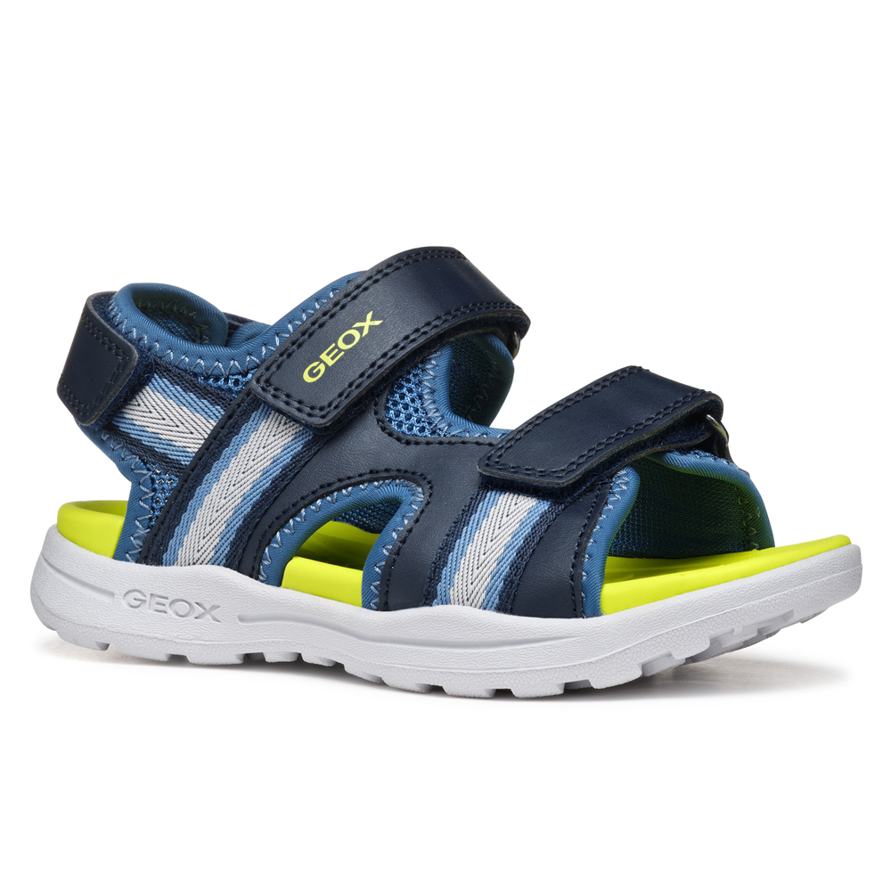Geox sandal with velcro. It features a yellow insole. The inner part consists of textile. The outsole consists of rubber.